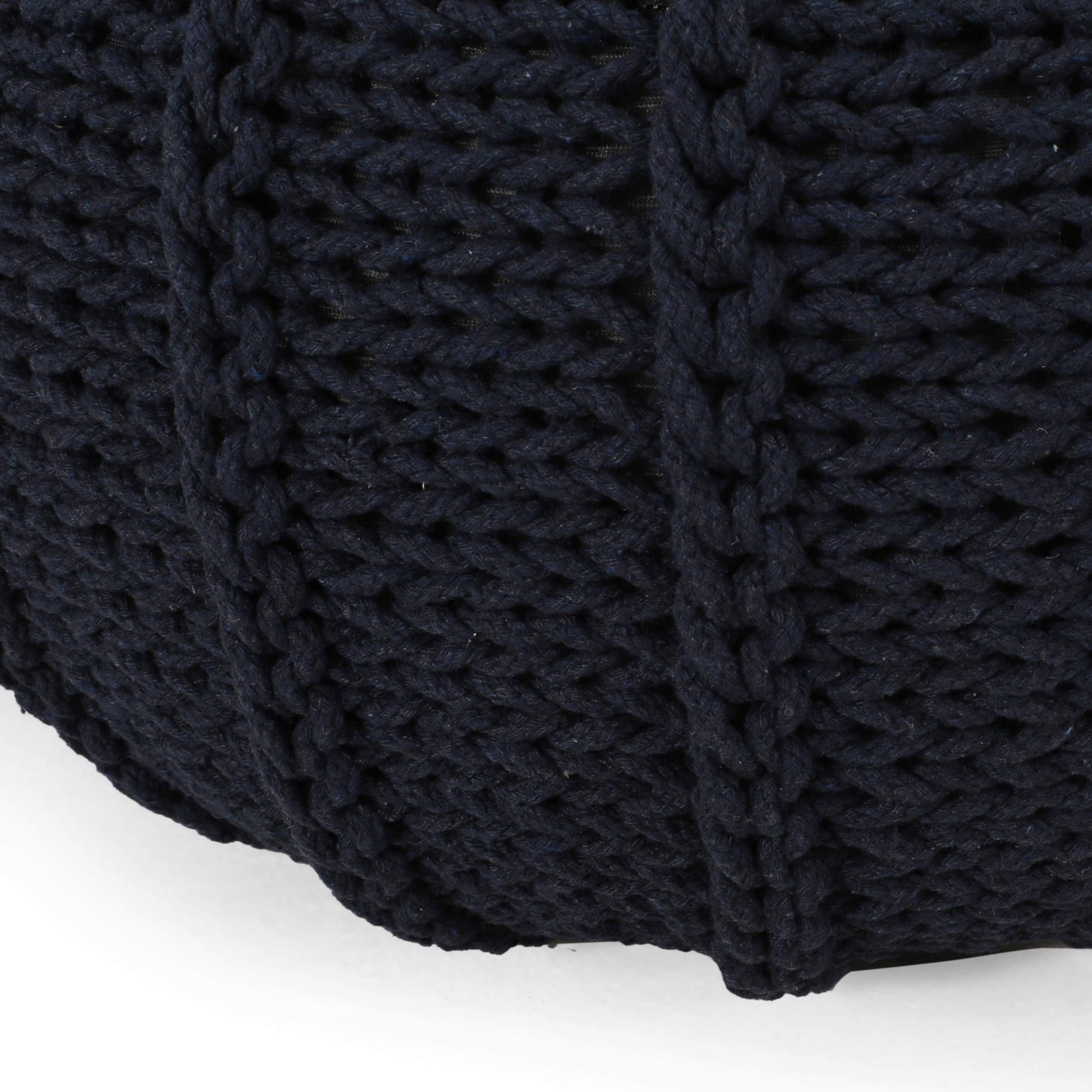 Transform your living space with this modern knitted cotton round pouf. Featuring a charming cable knit design and refreshing dark blue color, this versatile accessory brings both style and functionality to any room. Perfect for extra seating, a footrest, or simply as a decorative accent piece.