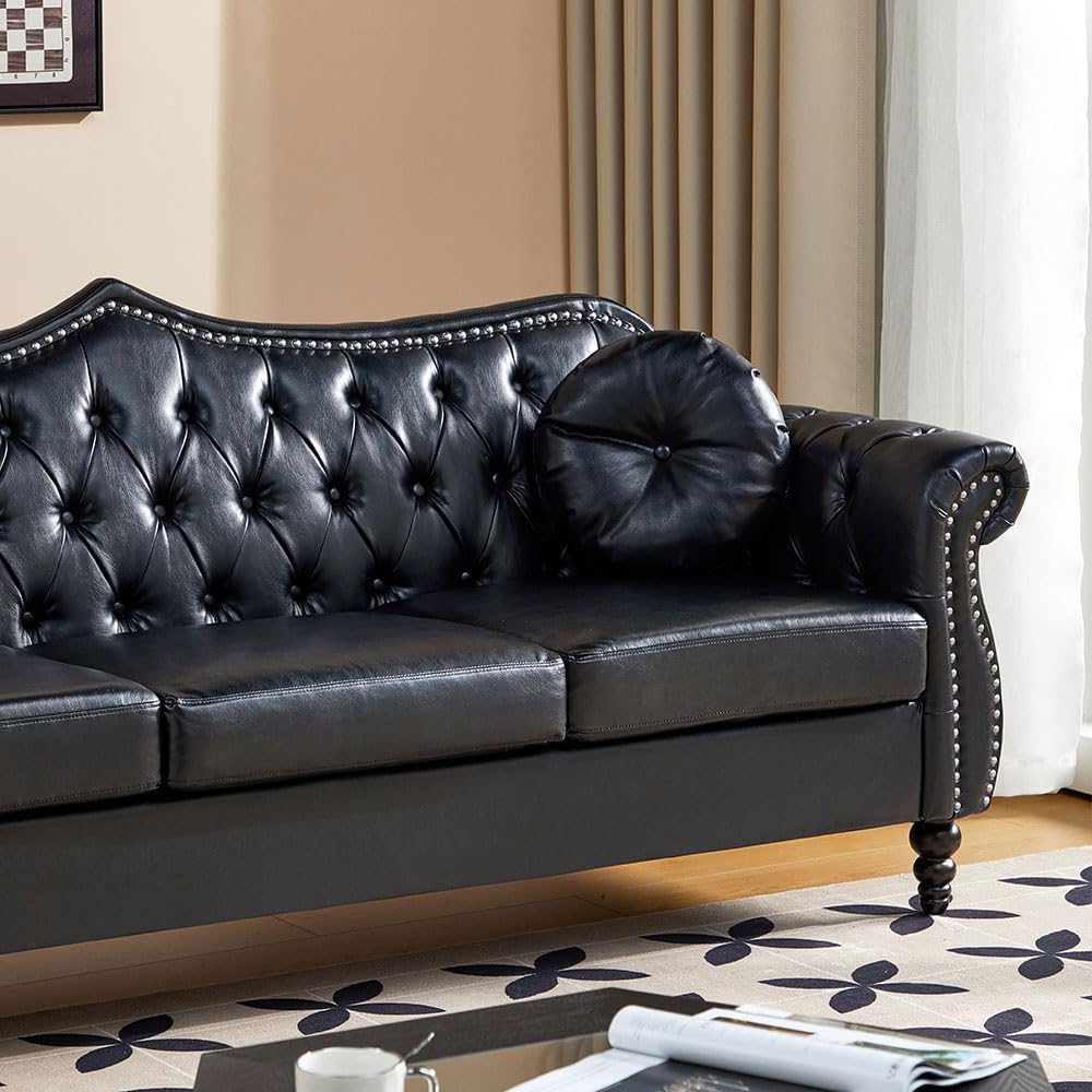 Modern PU Tufted Couch 3 Seater with Rolled Arms and Nailhead, Deep Button Nailhead Tufted Black Upholstered Couches, Roll Arm Classic Tufted Chesterfield Settee Leather Sofa for Living Room (Black)