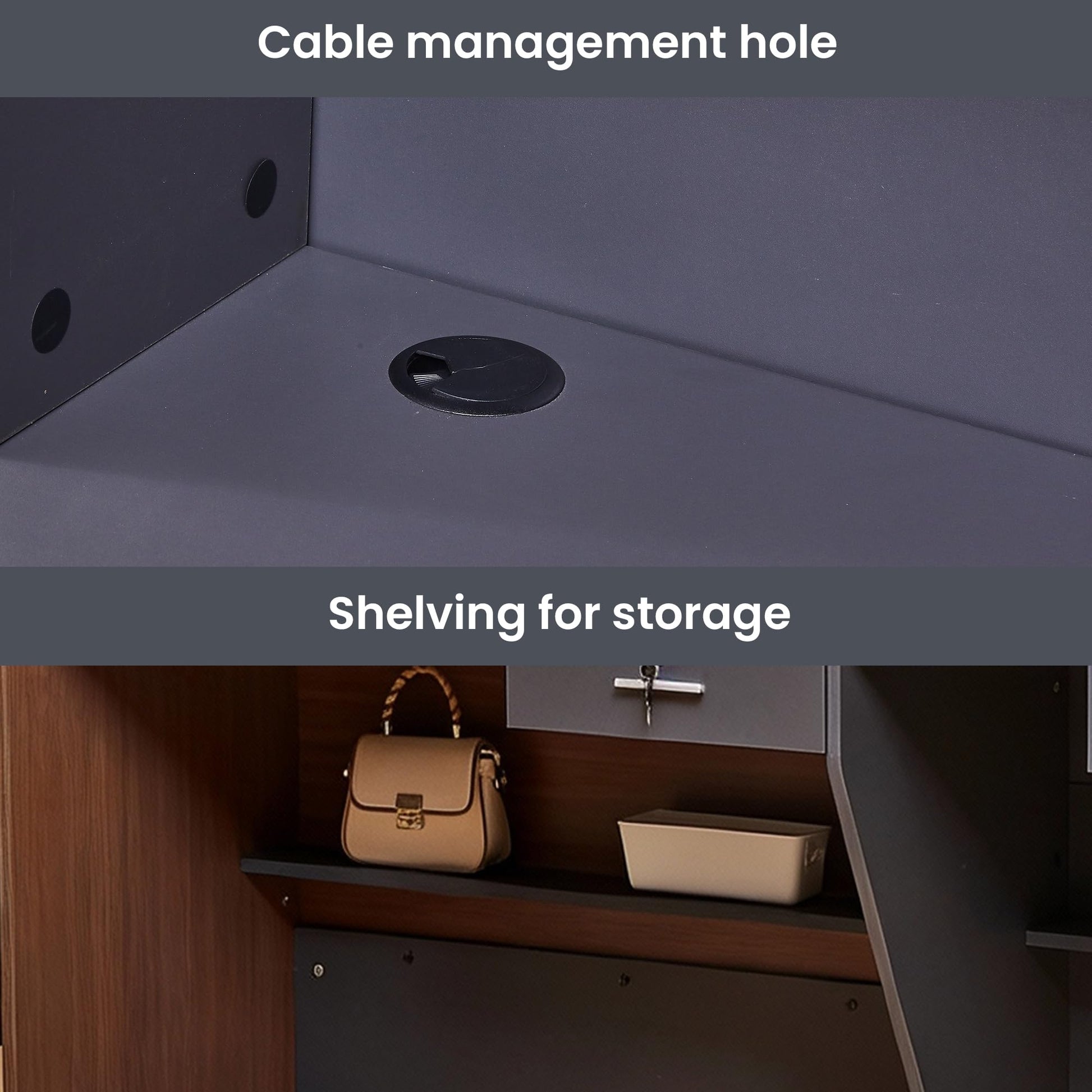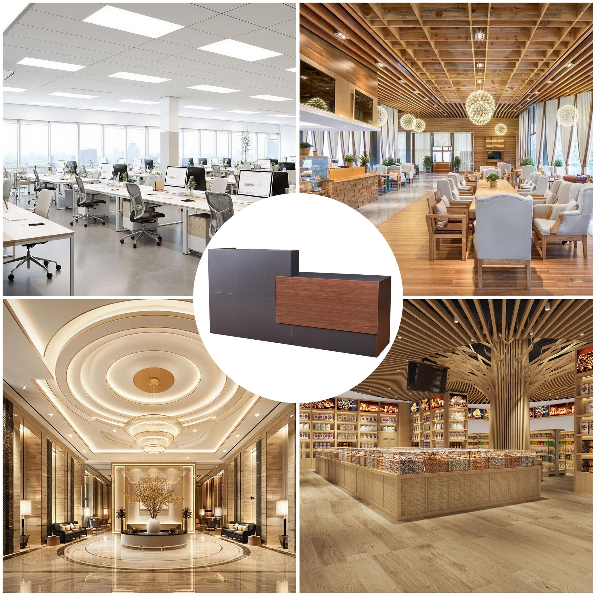 This modern reception desk combines professional aesthetics with practical functionality, perfect for corporate lobbies, hotels, restaurants, and salons. The walnut-brown front panel paired with an iron-gray frame creates a contemporary business look, while the semi-enclosed design maintains focus and visitor monitoring.