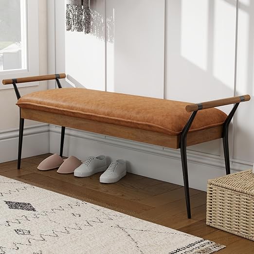 This mid-century modern ottoman bench combines style and functionality, featuring elegant arms and sturdy metal legs. Upholstered in premium chenille fabric, this versatile piece serves as a dining table bench, footstool, or entryway shoe bench. Perfect for dining rooms, bedrooms, and living rooms.