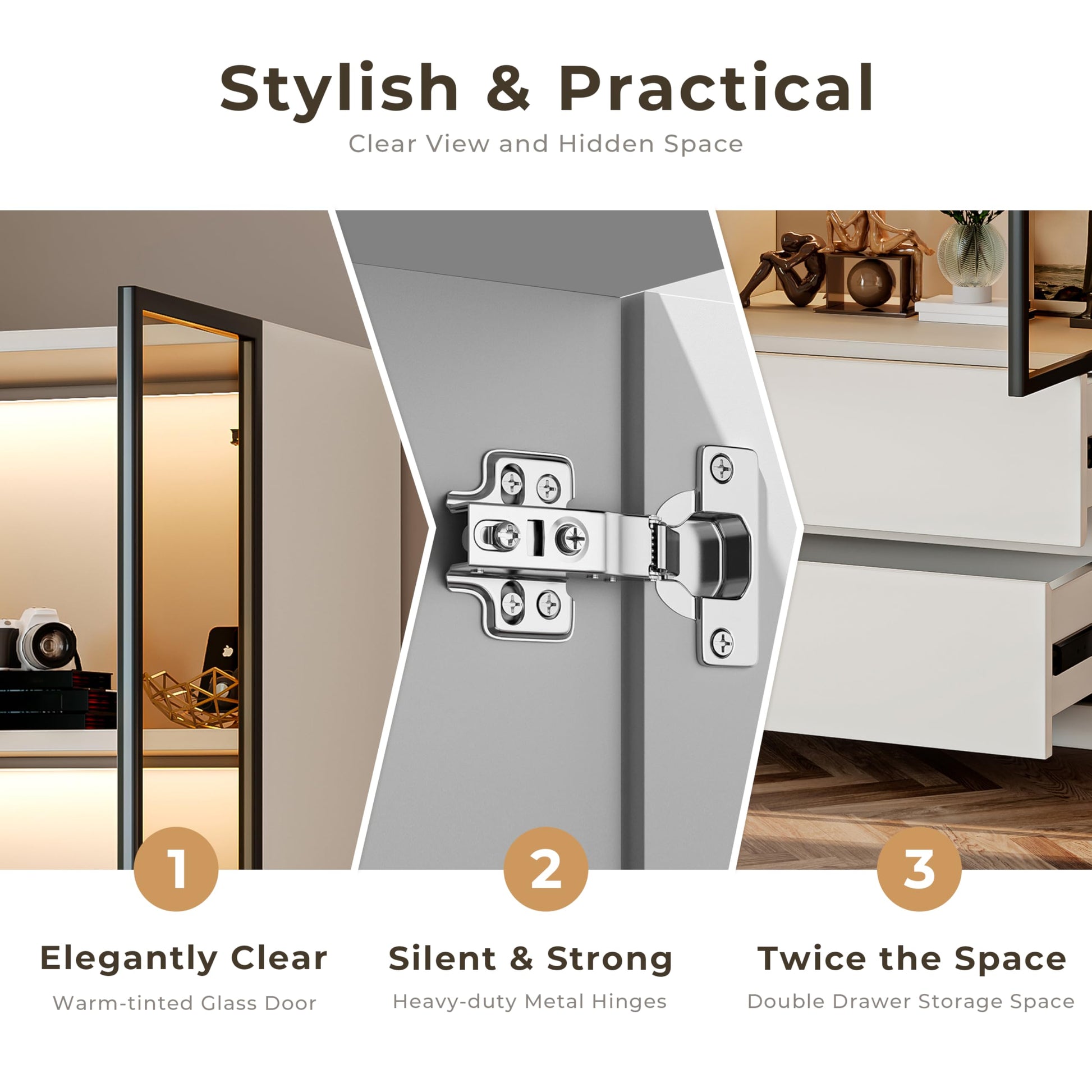 - Lighted Display Shelves: Features two brown transparent tempered glass doors with three LED light strips with motion sensors that automatically illuminate when someone approaches, providing supplemental lighting and a warm, stylish atmosphere