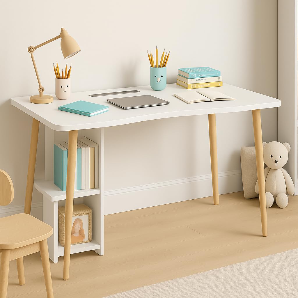 This modern white wooden computer desk combines functionality with contemporary design, perfect for creating an efficient workspace in your home office, bedroom, or study area.