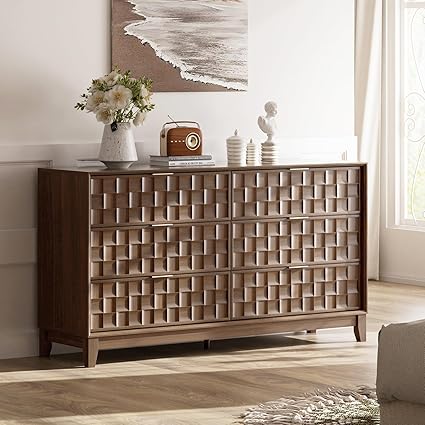 This modern wooden dresser combines sleek mid-century design with practical storage solutions. Featuring a champagne gold metal handle finish and distinctive 3D checkerboard texture, this piece adds sophisticated style to any bedroom, entryway, or hallway.