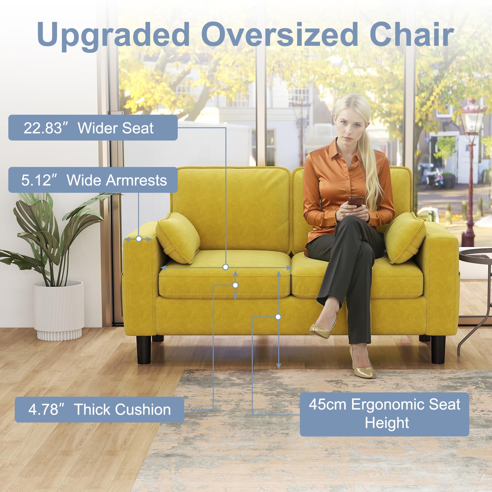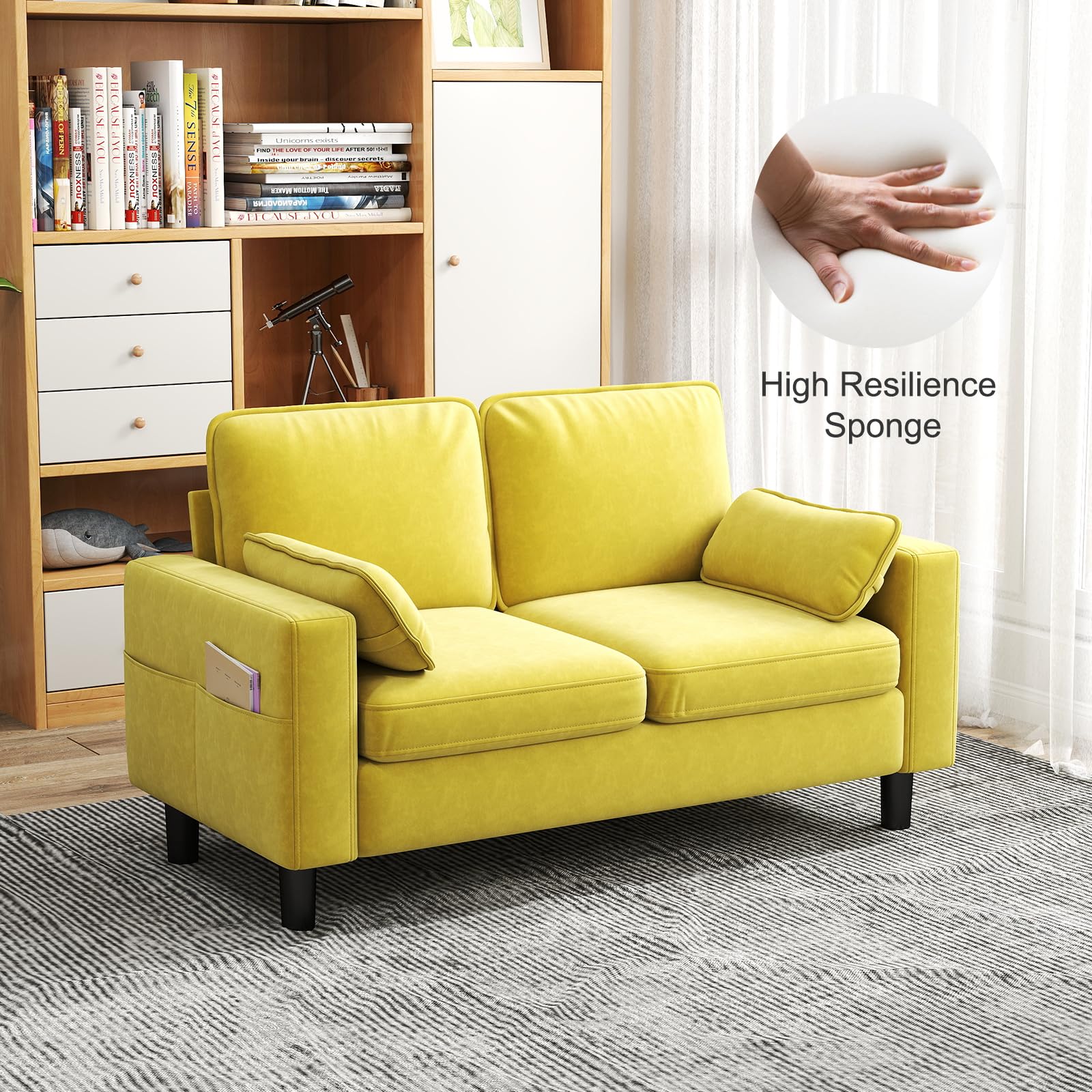 This contemporary loveseat sofa combines sleek design with exceptional comfort, making it a versatile addition to any living space. Featuring a vibrant yellow velvet upholstery and modern aesthetic, this 2-seater couch adapts seamlessly to living rooms, bedrooms, offices, and commercial spaces.