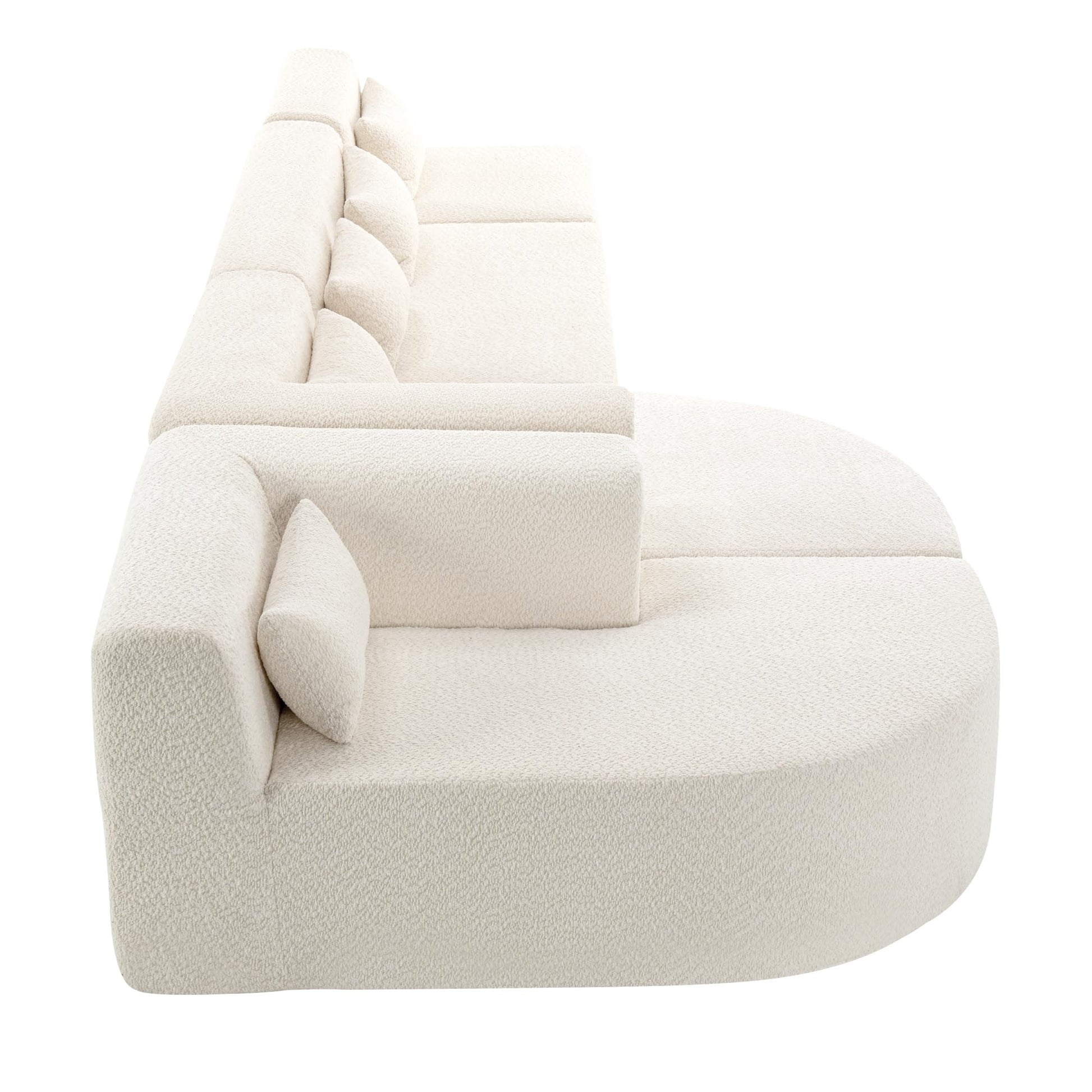 This modular sectional sofa offers versatile seating arrangements with 4 free-combined pieces, allowing you to customize your living space. Upholstered in premium boucle fabric, this modern sofa features 2 chaise lounges and 5 back pillows for ultimate comfort and style.