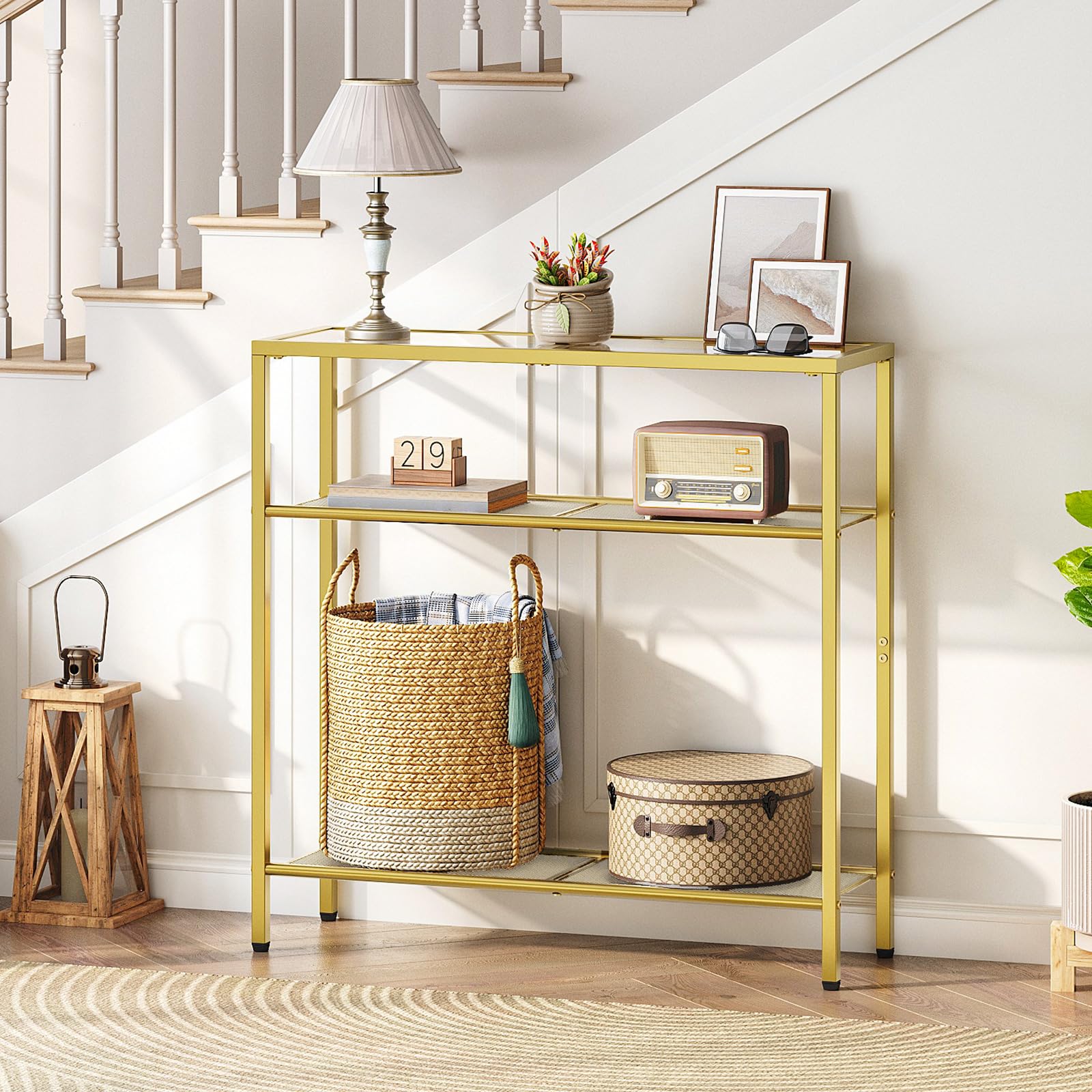 Elevate your entryway, living room, or hallway with this sleek 3-tier narrow console table featuring tempered glass shelves and a modern gold finish. Perfect for displaying décor, storing essentials, or creating an elegant focal point in any space.