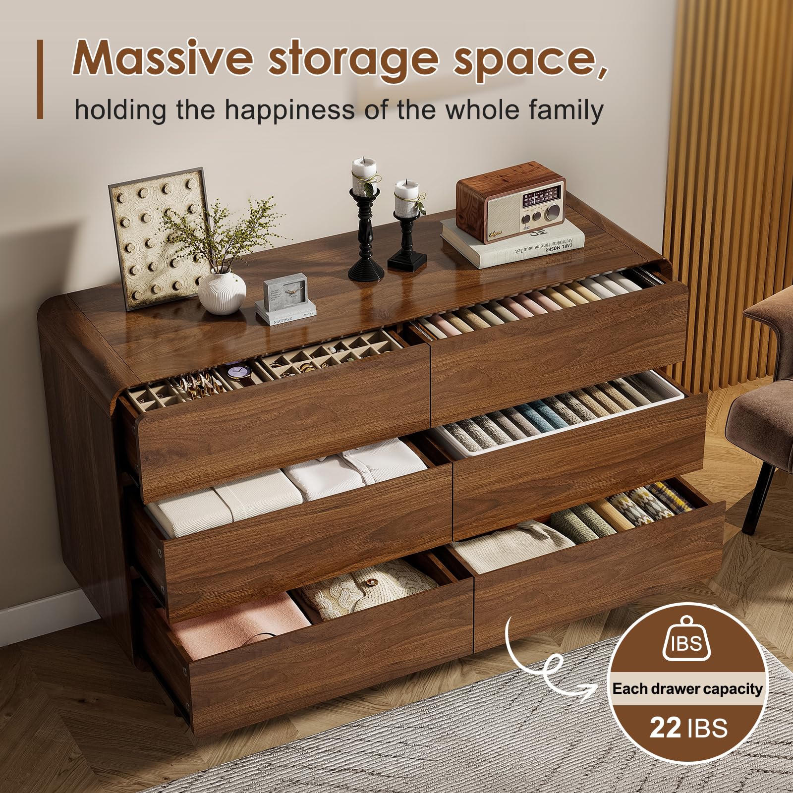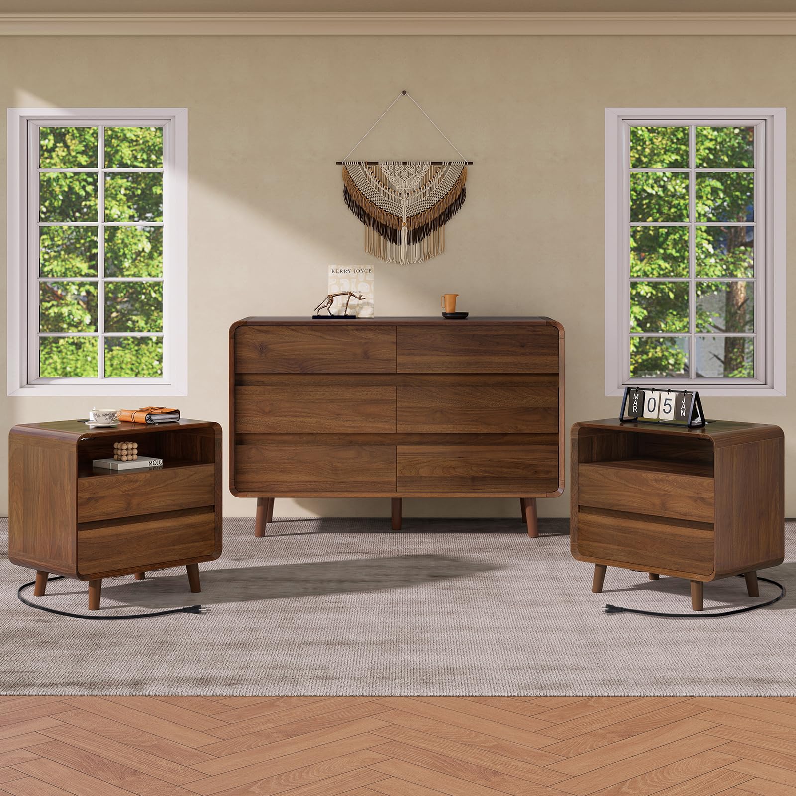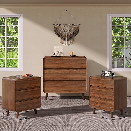 - Complete Set: Elegant 3-piece bedroom furniture set featuring a spacious 6-drawer dresser and two matching nightstands in beautiful walnut finish