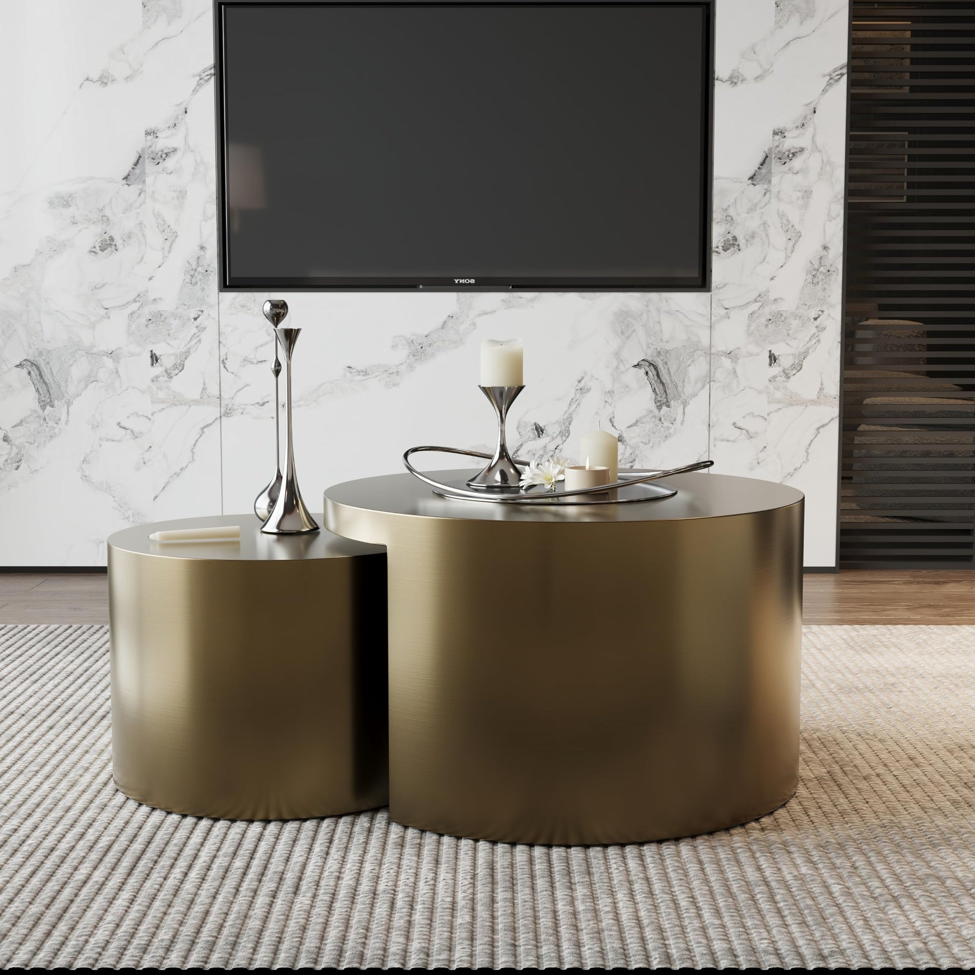 Elevate your living room with this sophisticated nesting coffee table set featuring a luxurious gold-brushed textured finish. This versatile 2-in-1 design offers both style and functionality, allowing you to configure the tables together or separately to suit your space and entertaining needs.