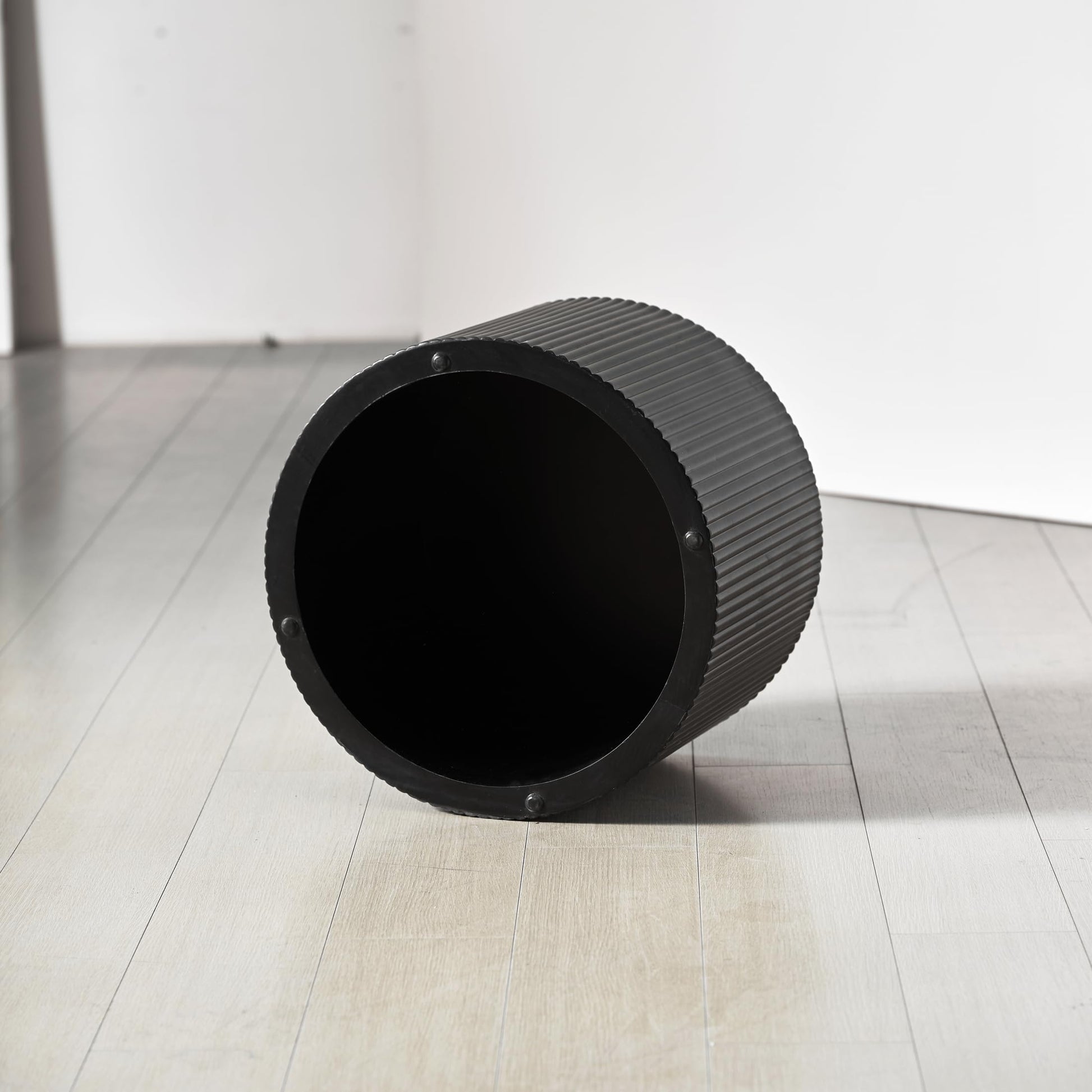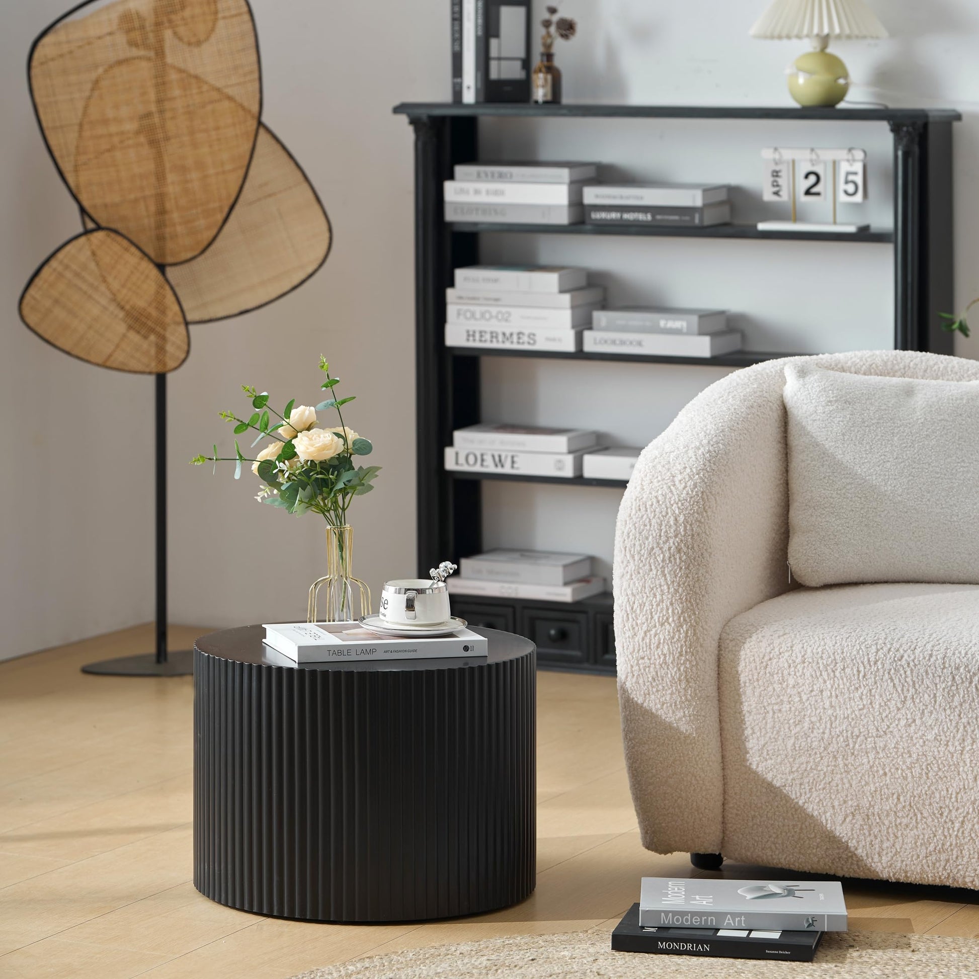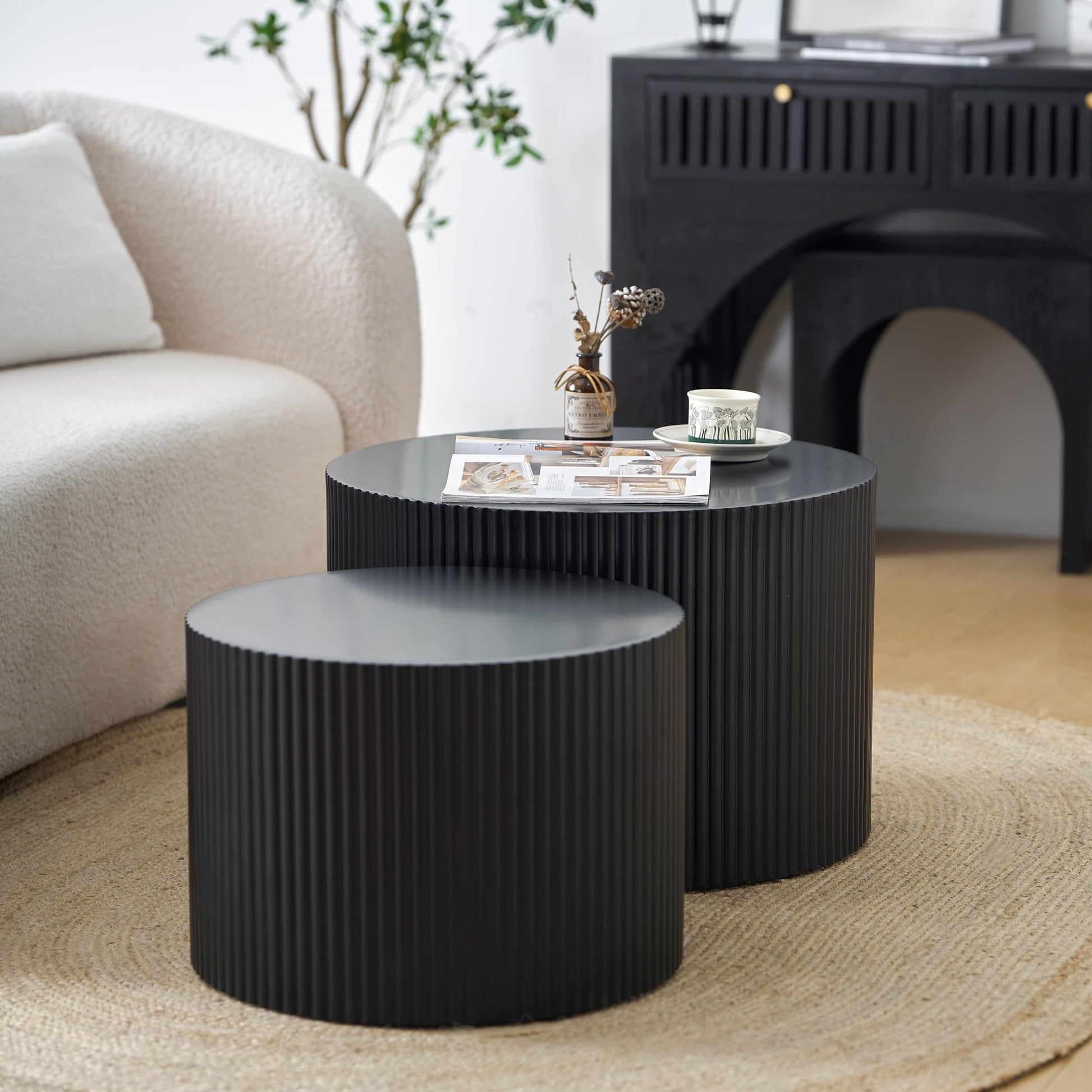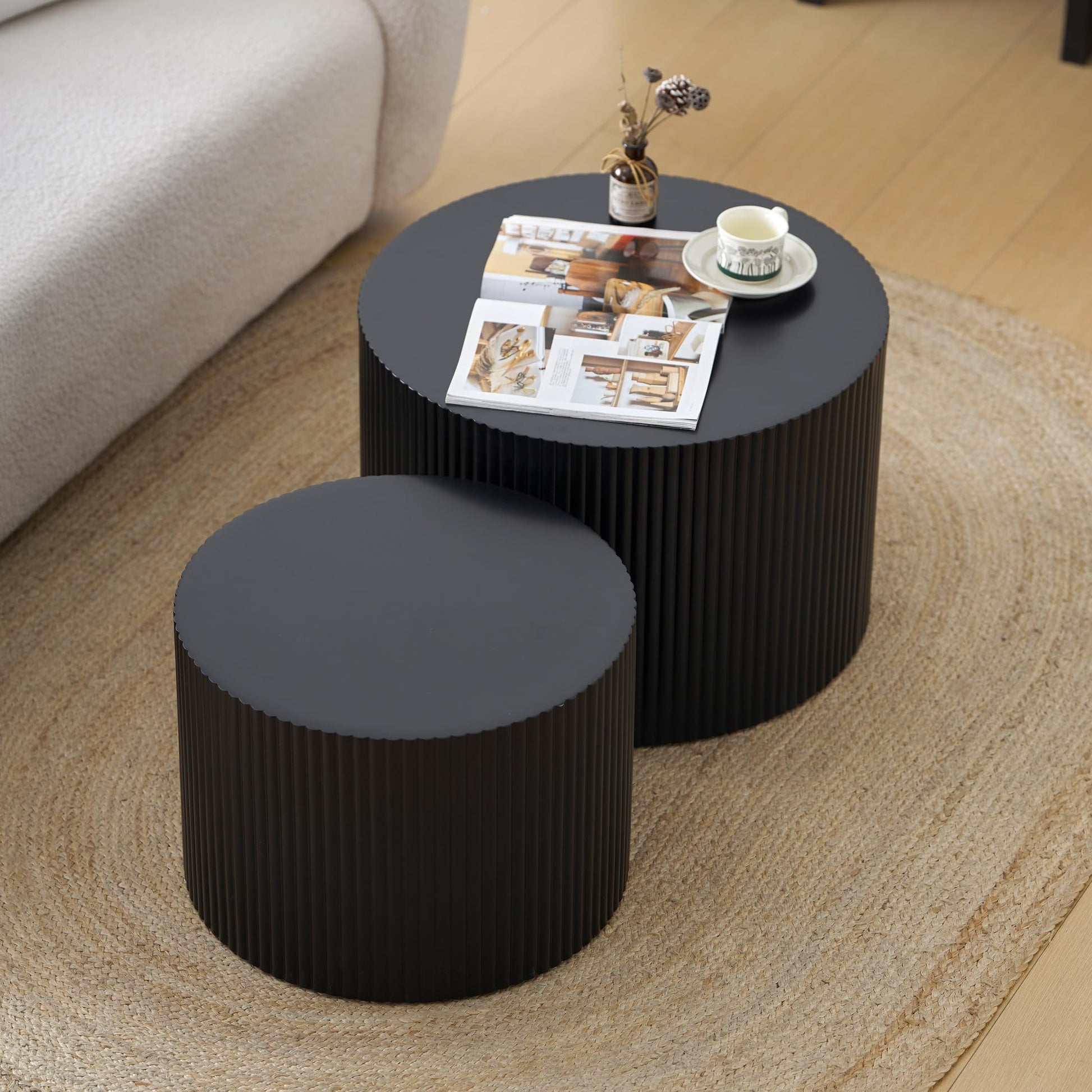 Nesting Coffee Table Set of 2, Modern Drum Side End Wave Stripe Round Coffee Table for Living Room, Bedroom, Black