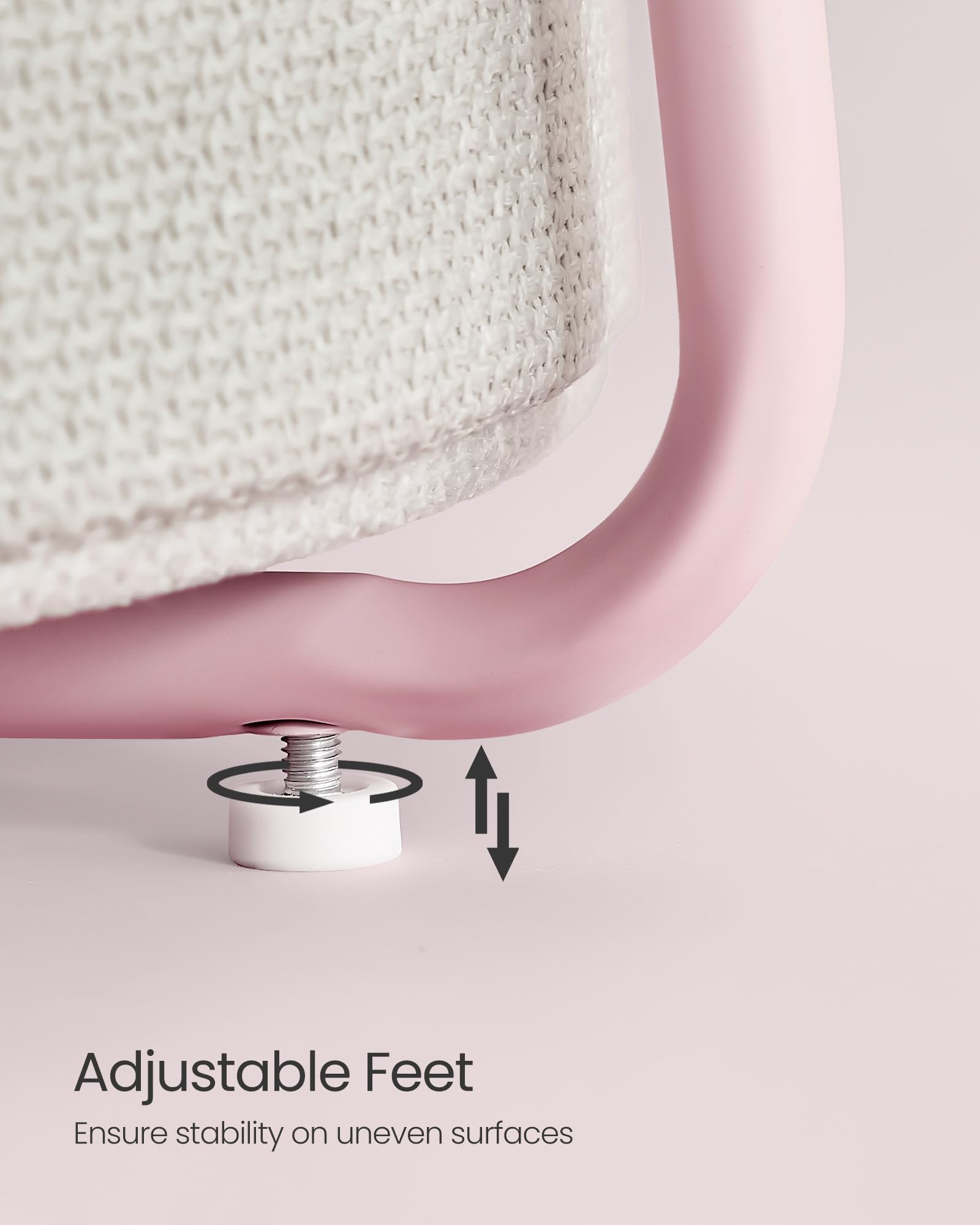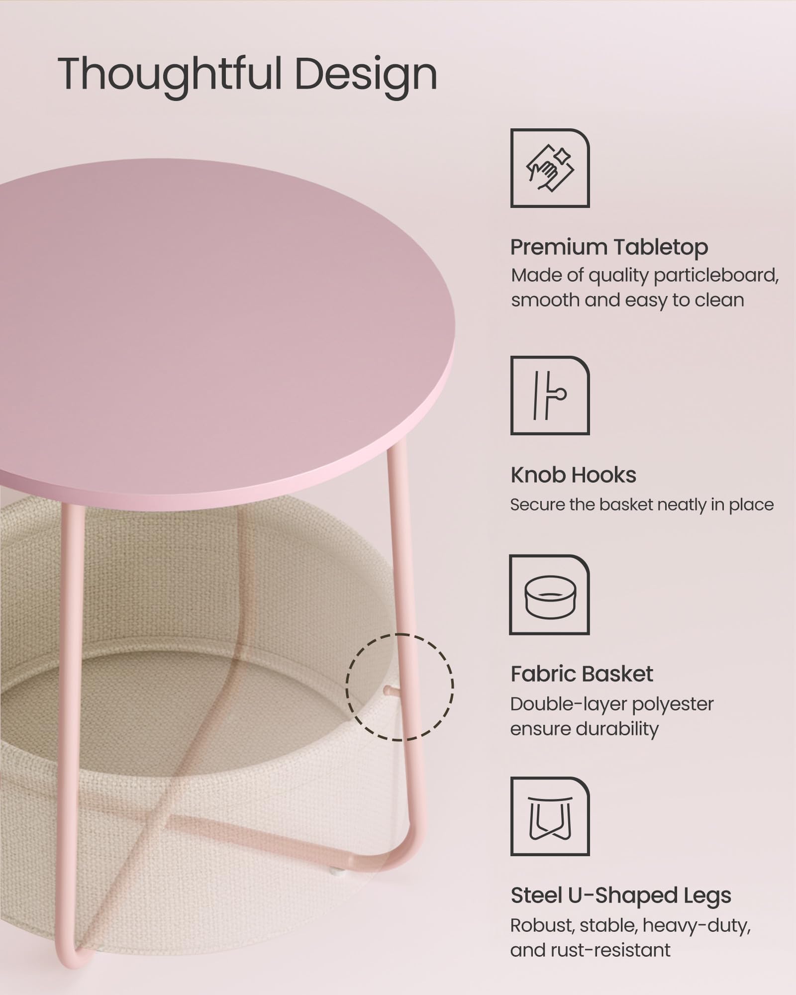 - Integrated fabric basket provides hidden storage for clutter-free spaces