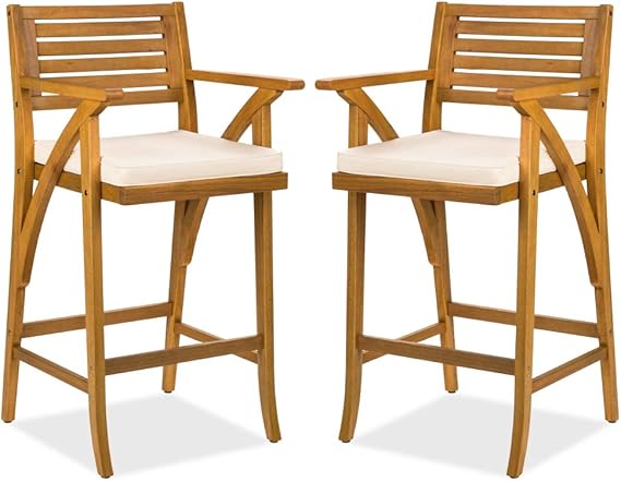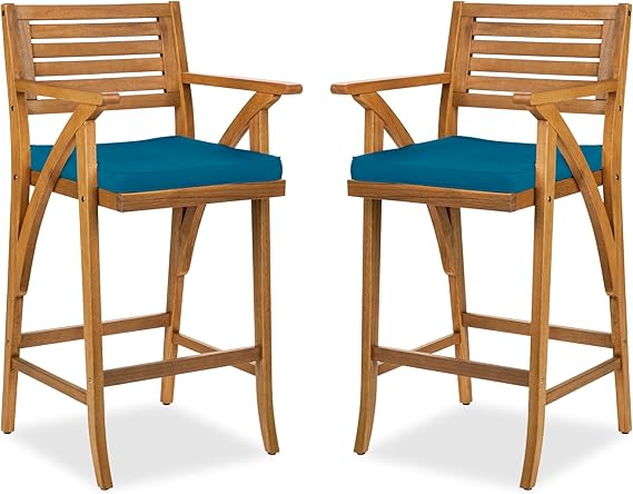 Elevate your outdoor entertaining space with this set of two bar height chairs designed for comfort and durability. Wide-seated chairs feature open backrests, high armrests, a sturdy footrest bar, and firm seat cushions that redefine outdoor seating comfort.