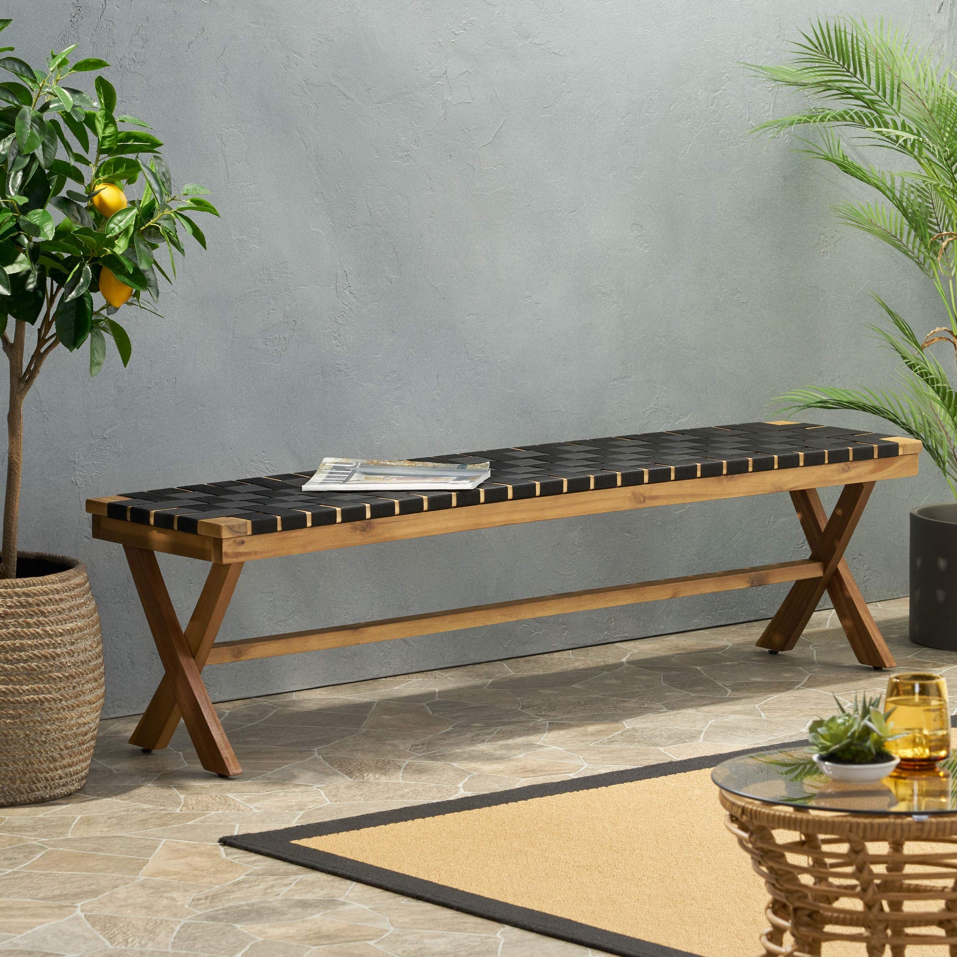 This outdoor bench combines natural acacia wood with durable rope seating, creating a stylish and functional addition to your patio, garden, or deck. The black finish frame paired with teak-colored wood offers a contemporary aesthetic that complements any outdoor space.