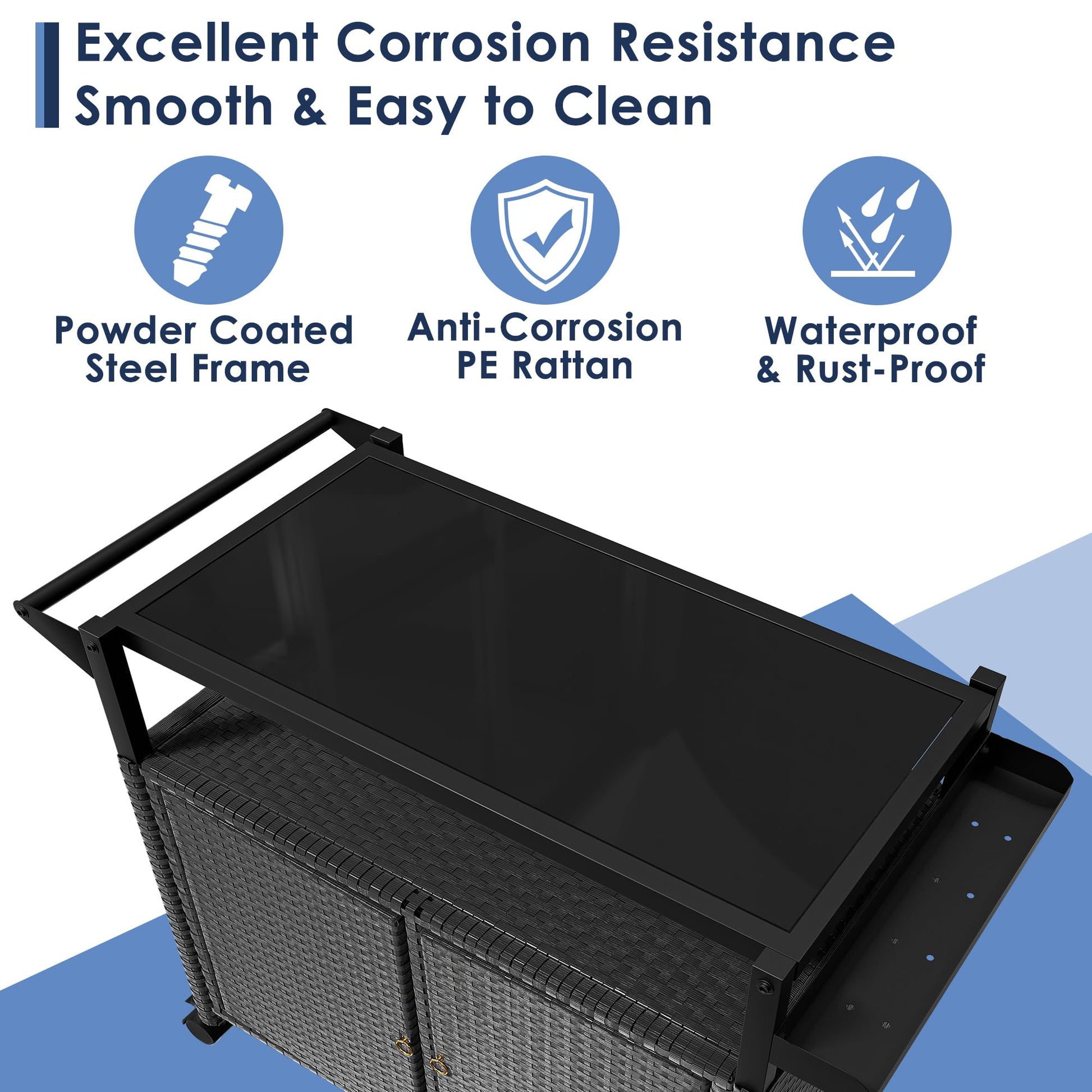 This modern outdoor bar cart combines functionality with elegant design, perfect for your patio, poolside, or outdoor kitchen. Featuring a sleek tempered glass top and enclosed wicker storage cabinet, it offers exceptional storage capacity and mobility for all your outdoor entertaining needs.