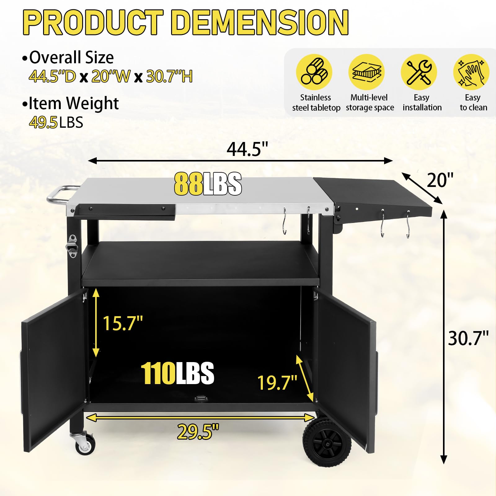 - Multifunctional design serves as grill cart, bar cart, and portable kitchen island