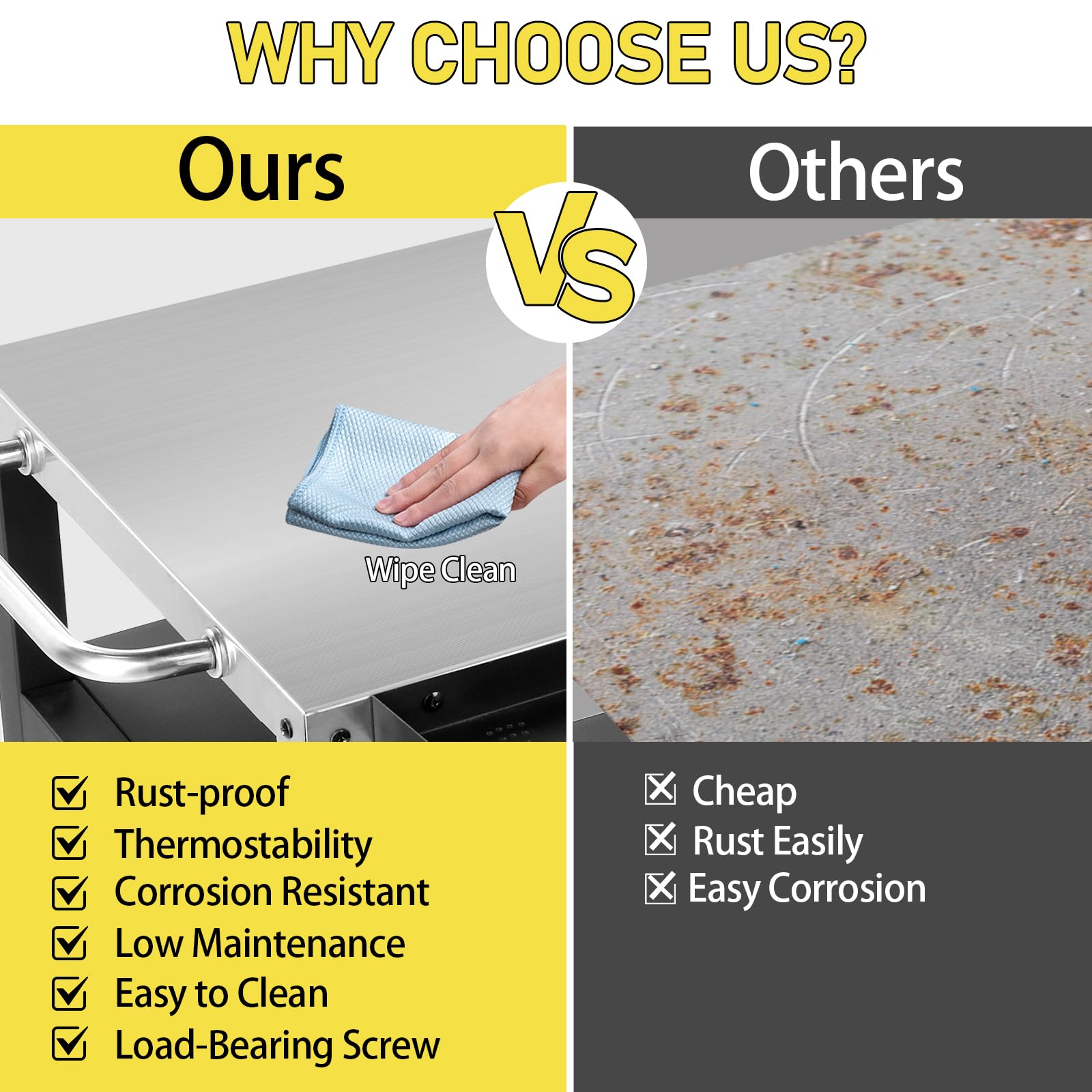 - Durable stainless steel top surface for easy cleaning and food prep
