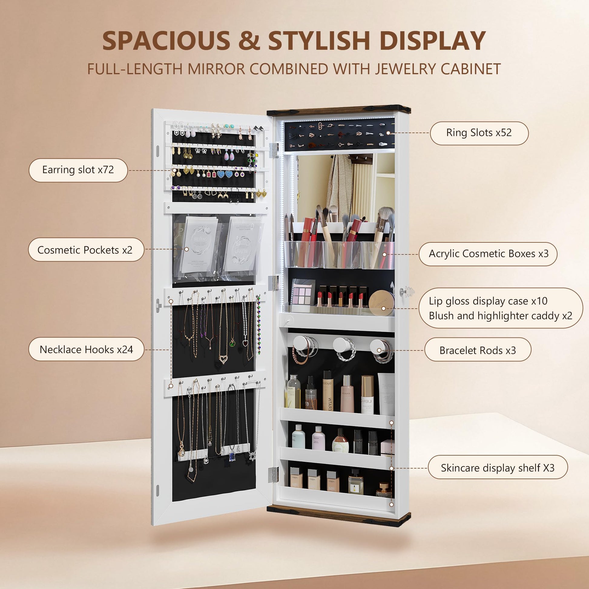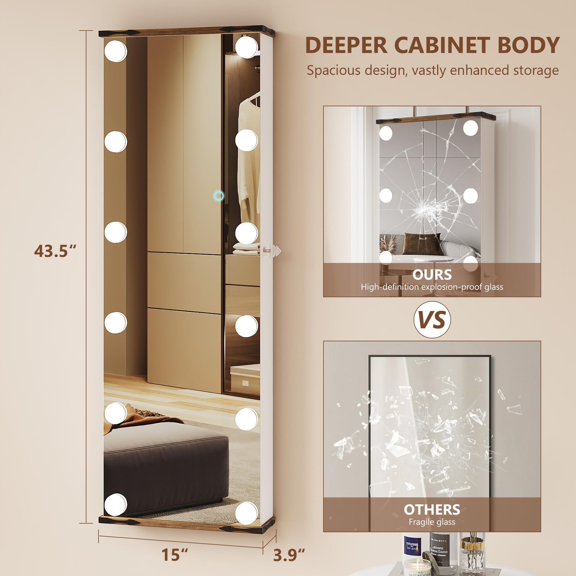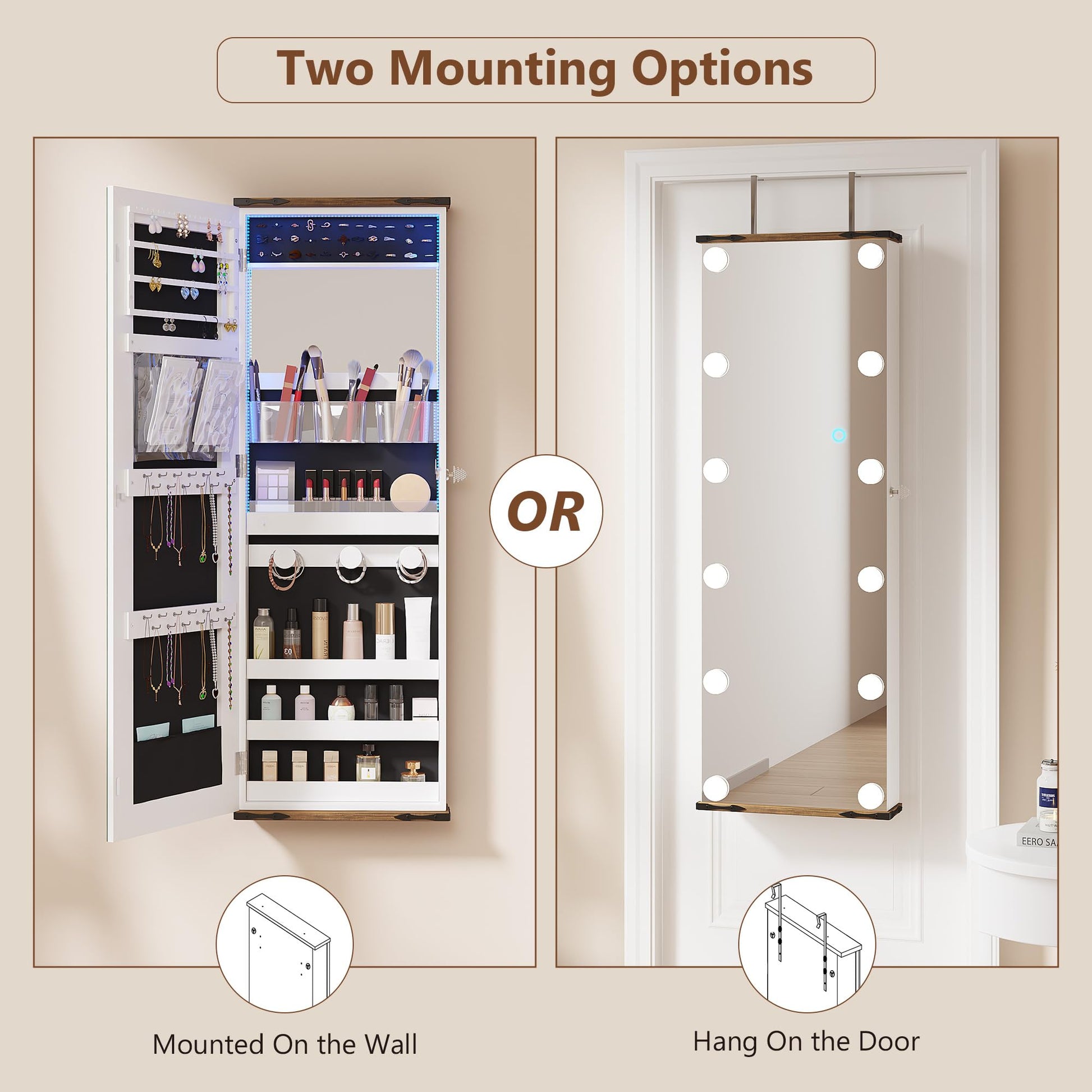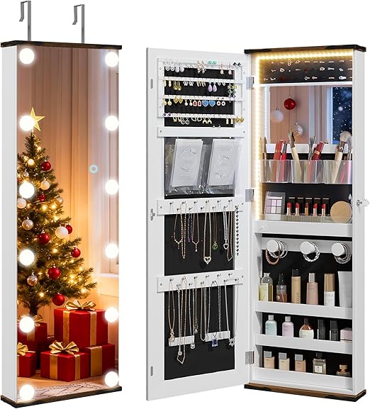 Transform your jewelry storage with this elegant over-the-door jewelry armoire featuring 12 Hollywood-style LED bulbs and a full-length mirror. This lockable jewelry cabinet offers spacious storage compartments to keep your accessories organized and easily accessible while adding a touch of glamour to your room.