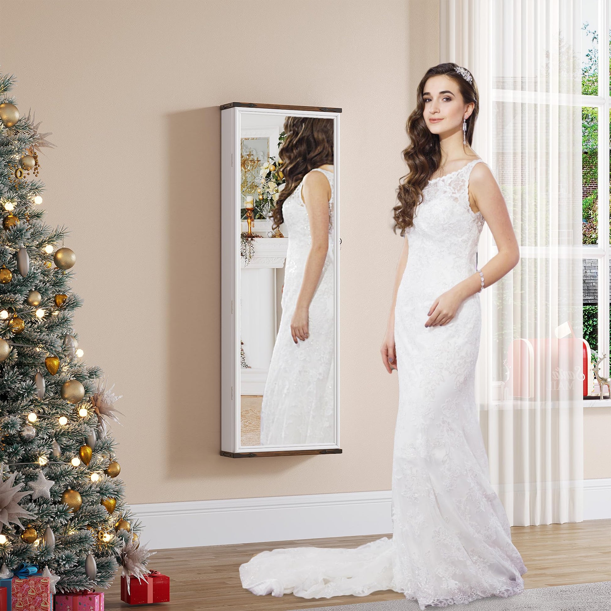 Transform your space with this modern over-the-door jewelry organizer that combines a full-length mirror with secure storage. This wall-mountable jewelry cabinet features integrated LED lighting to illuminate your collection and a built-in lock for added security.