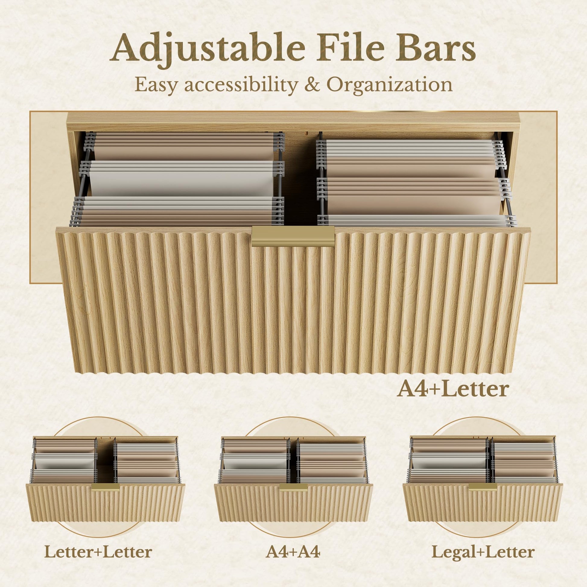 - Versatile File Compatibility & Extended Surface Space:The Lateral File Cabinet is designed to accommodate a range of file sizes—including Legal, Letter and A4—making it easy to organize and access all your documents in one place. No more struggling to find the right fit. The spacious 30" top surface offers plenty of room for a printer, décor, or everyday essentials, doubling as a functional work or display area.
