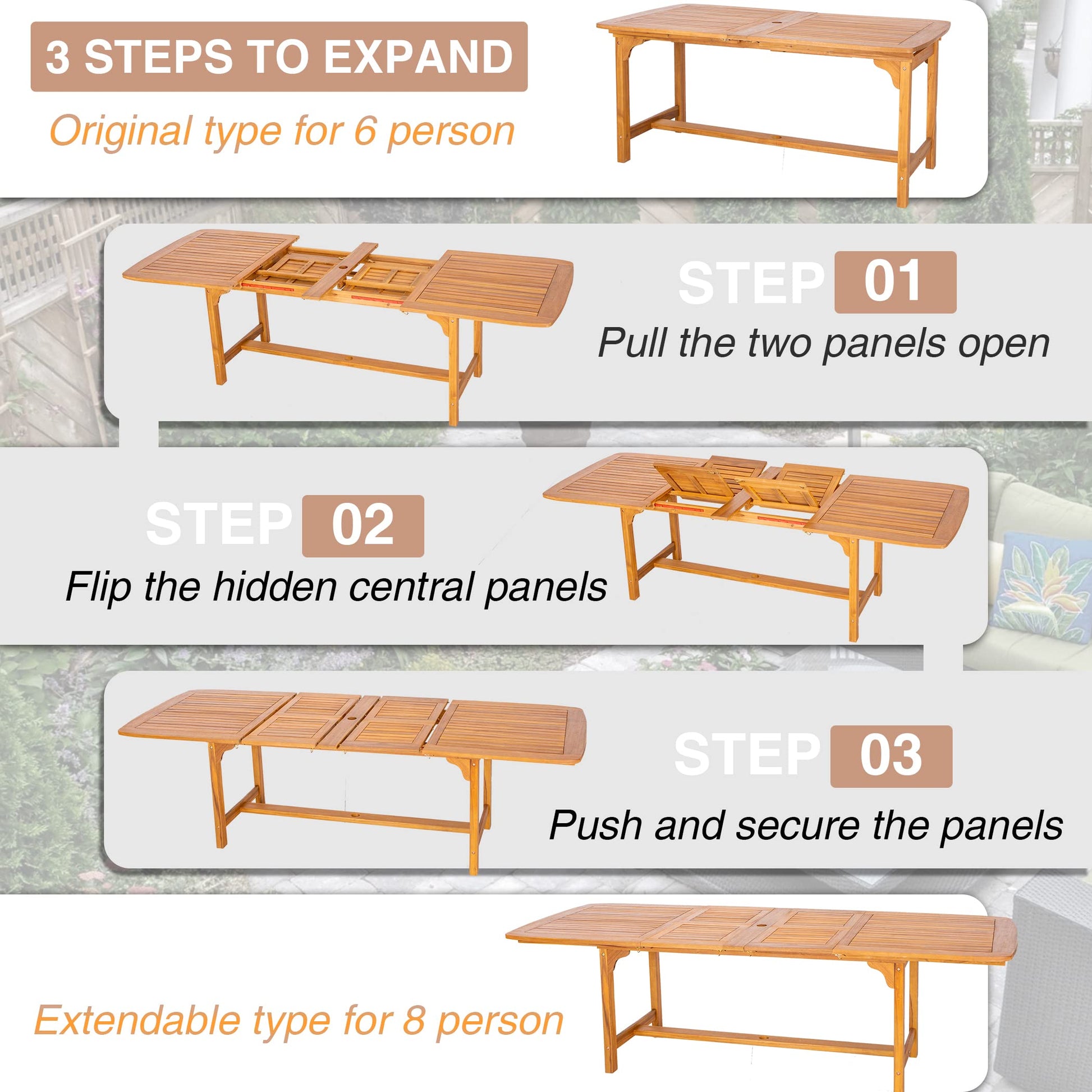 - 【Extendable Wood Dining Table】 The dining table made of 100% solid acacia wood, which features uv and fade resistance. Designed with expandable function, the table can be extended for 6-8 person dining by flipping the central hidden panels, which is convenient and useful.