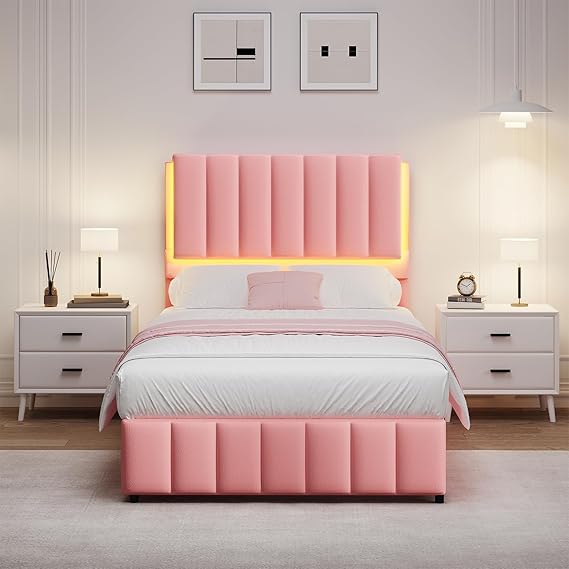 Pink Queen LED Bed Frame with Upholstered Headboard