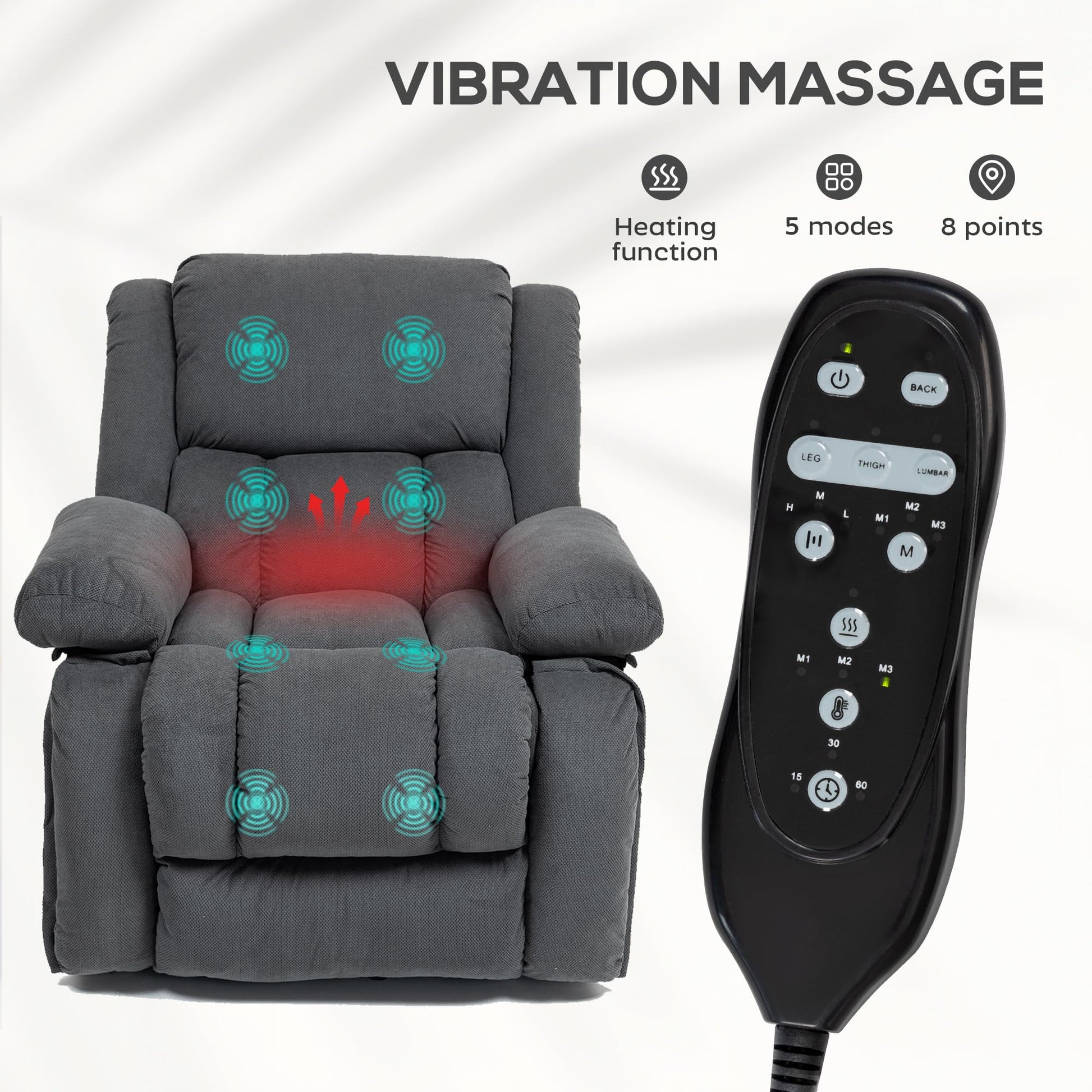 Experience ultimate comfort and relaxation with this power lift recliner chair designed for elderly users and anyone seeking therapeutic seating. This overstuffed reclining chair combines advanced features including vibration massage, soothing heat therapy, and smooth power lift assistance to help you stand with ease.
