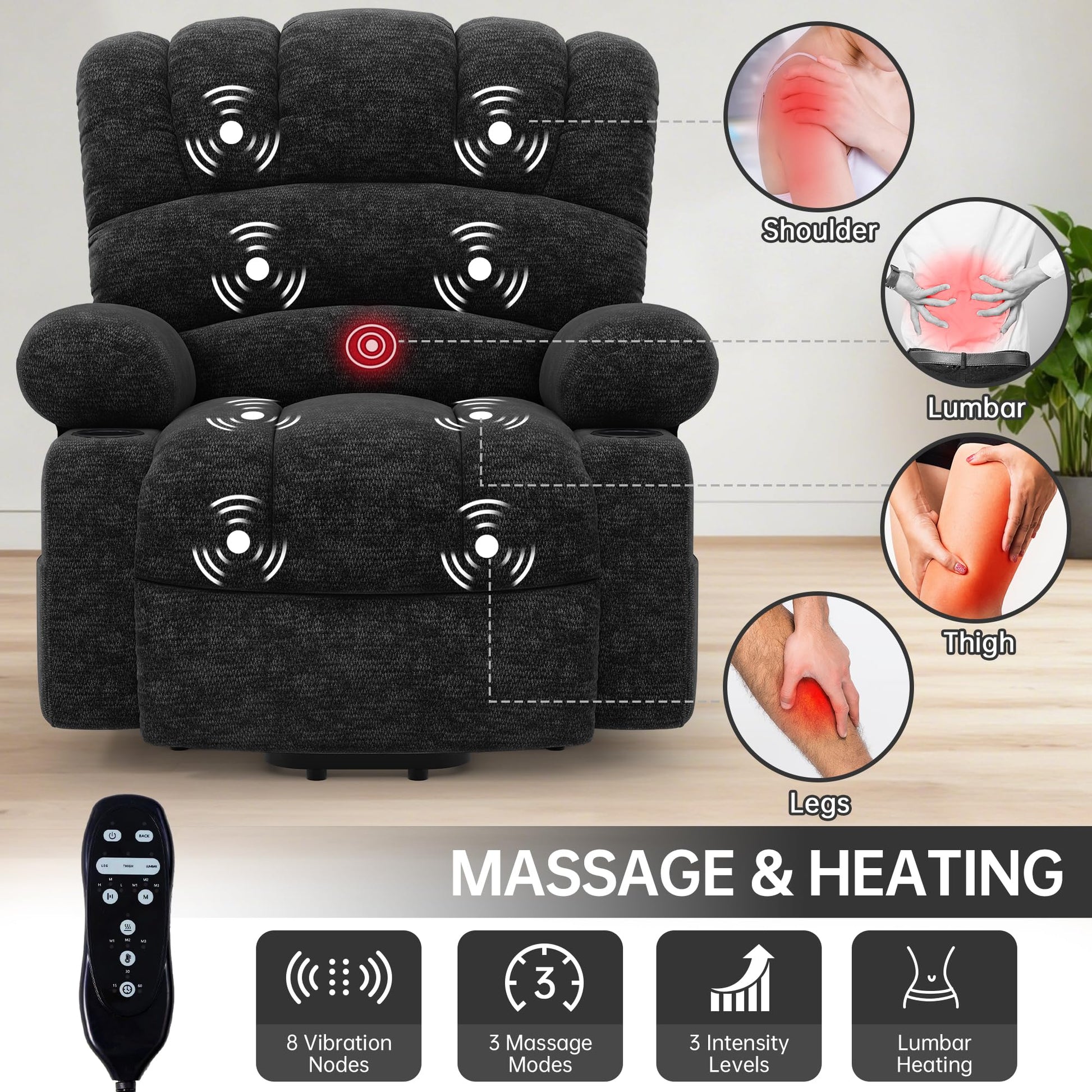 - 8-Point Massage System: Customizable vibration massage with 3 intensity patterns targeting back and leg muscles, with convenient timer settings (15/30/60 minutes)
