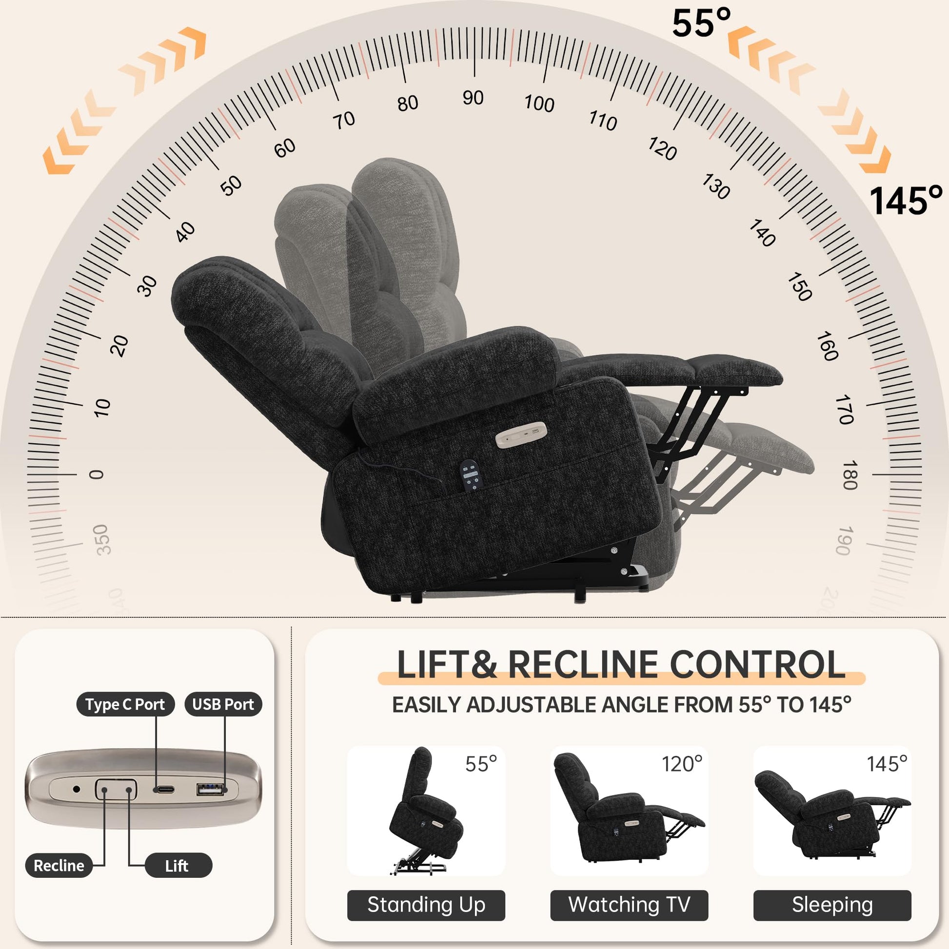 - Power Lift Function: Electric controls allow smooth positioning between 55-145 degrees, making it easy to stand up or recline with the touch of a button