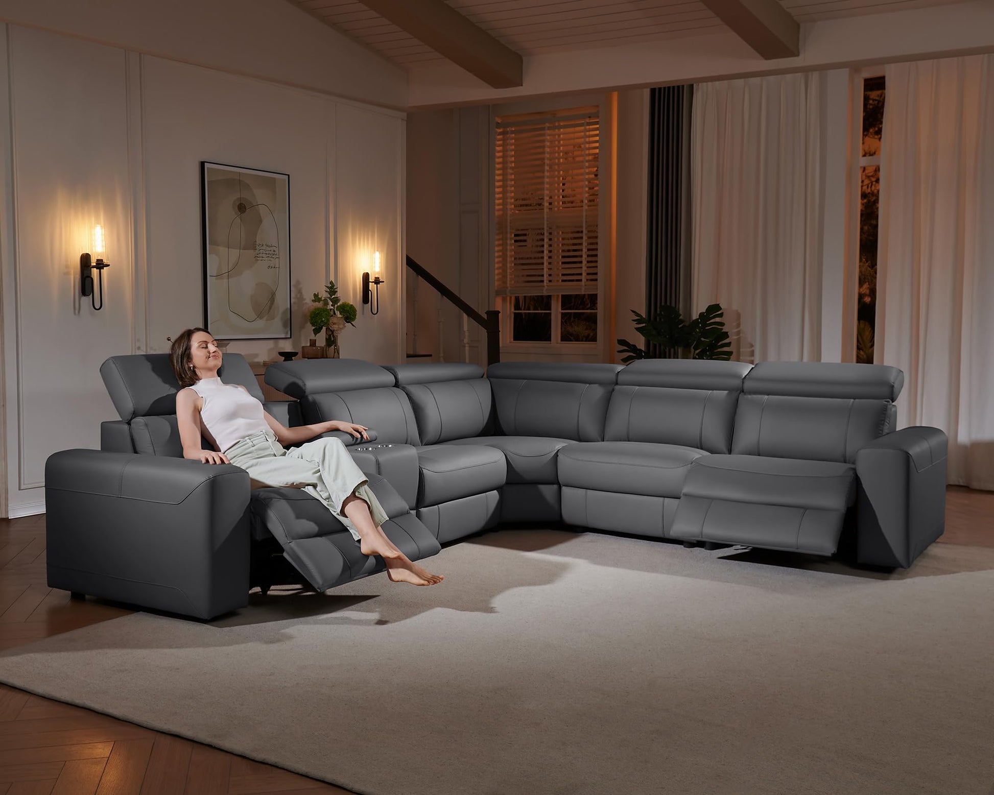 Transform your living room with this premium power recliner sofa featuring electric dual reclining functionality and a convenient center console. Upholstered in high-quality leather, this sectional couch combines comfort, style, and modern convenience for the ultimate relaxation experience.