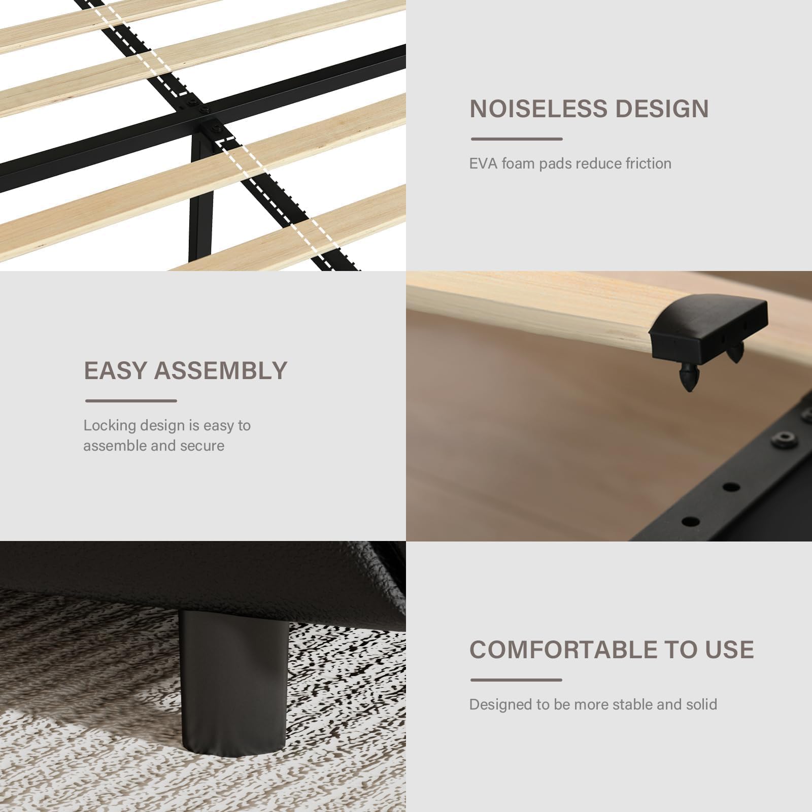 - Solid Construction: Durable metal frame with wooden slats and floor-standing design ensures stability without box springs