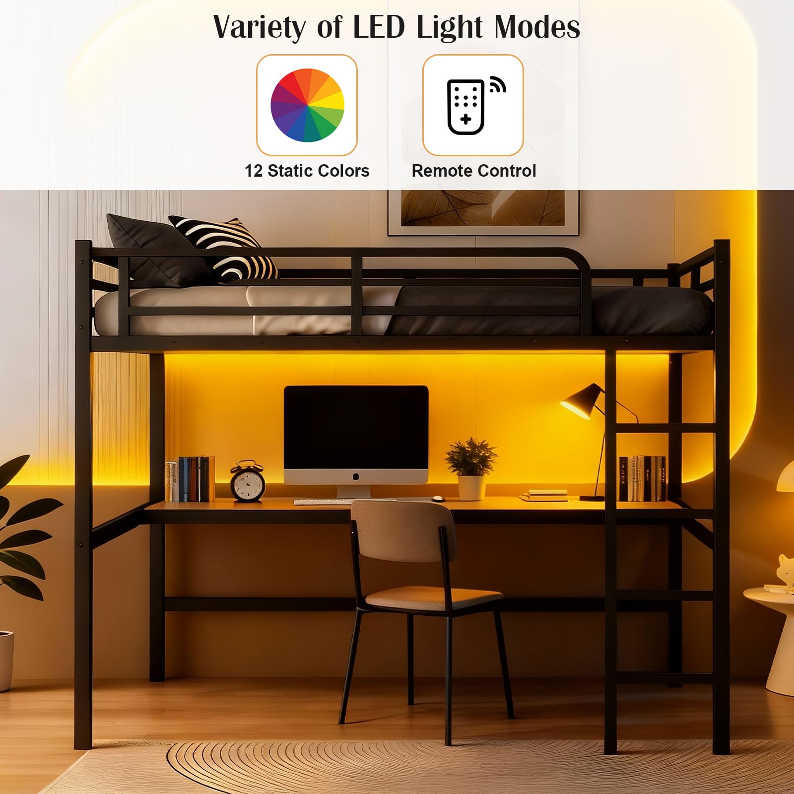 Queen Loft Bed with Desk and LED Lights