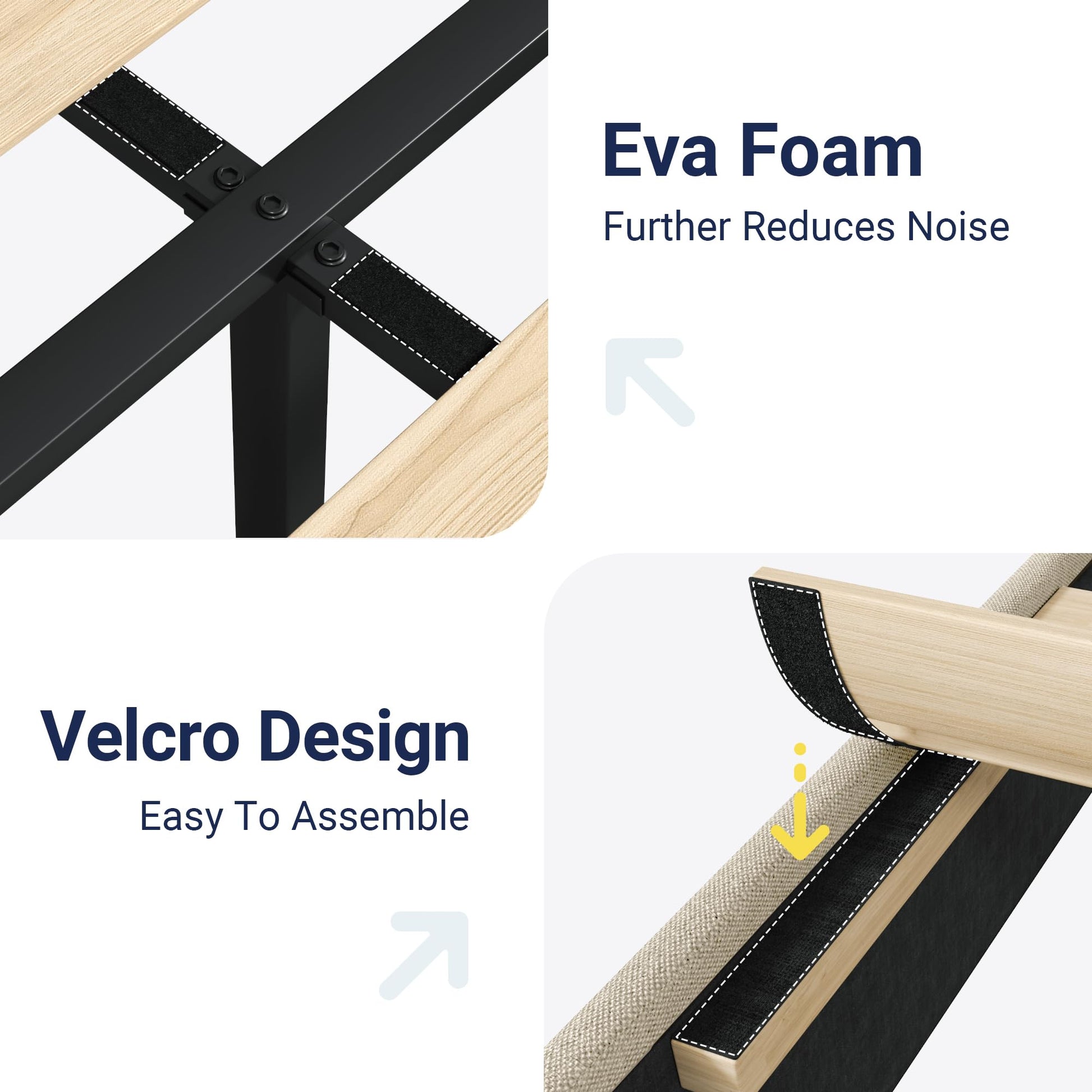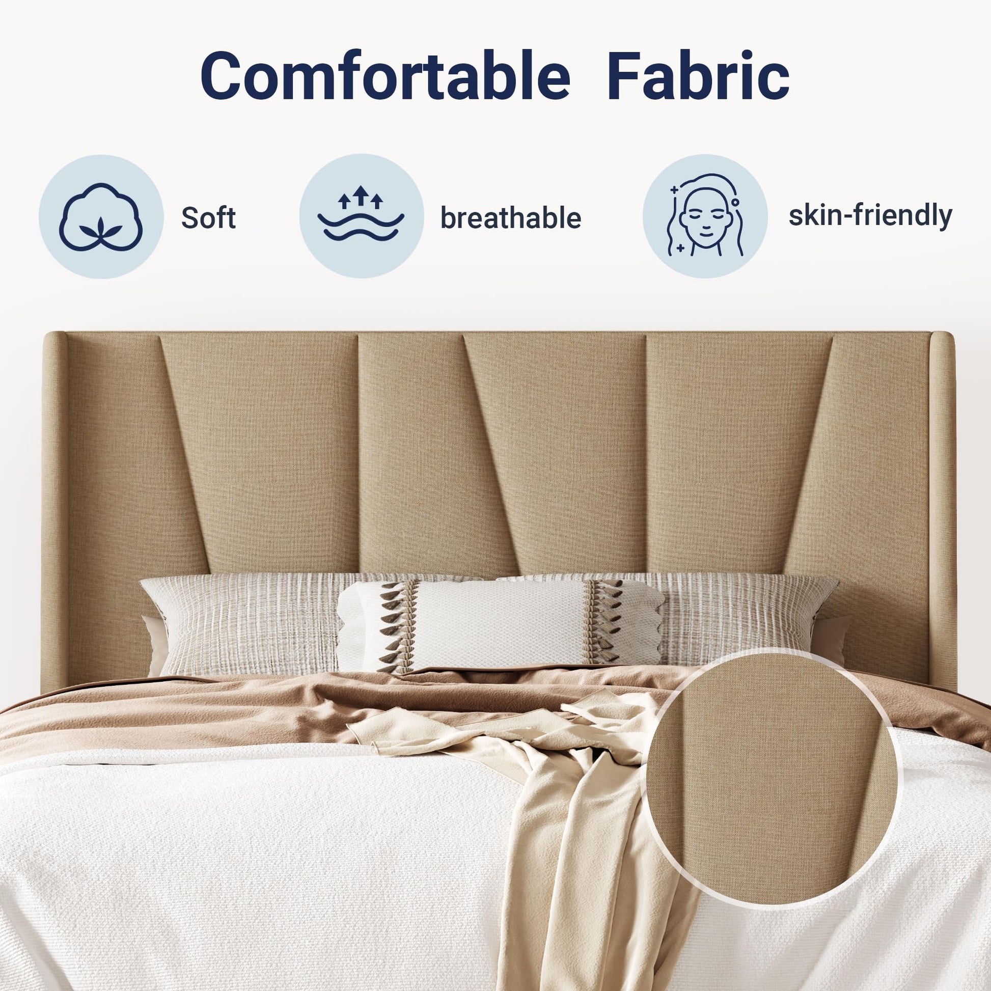 This upholstered platform bed frame features a distinctive geometric wingback headboard wrapped in breathable linen fabric, bringing bohemian charm and modern sophistication to your bedroom. The generously padded 48-inch high headboard provides exceptional comfort for reading or relaxing in bed.