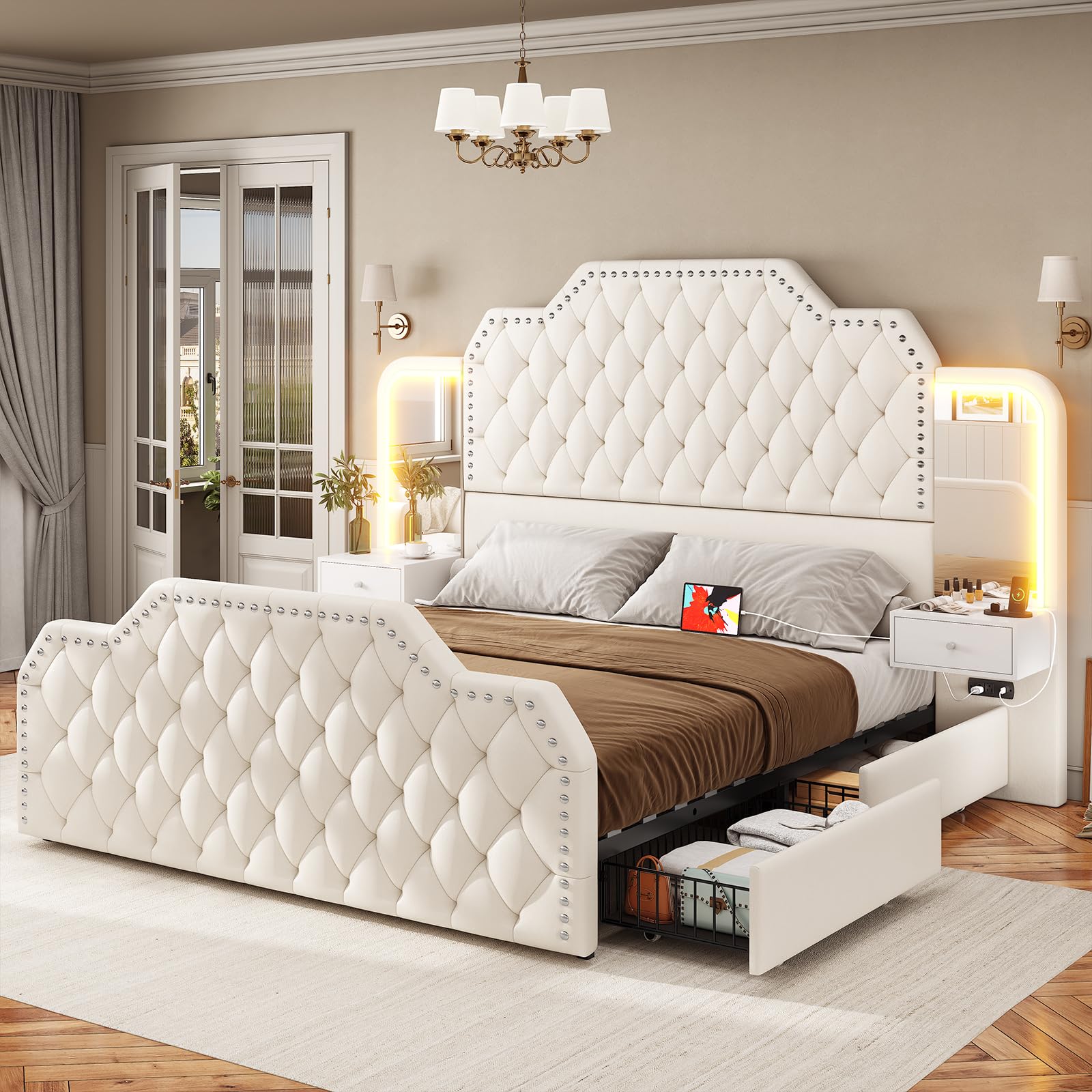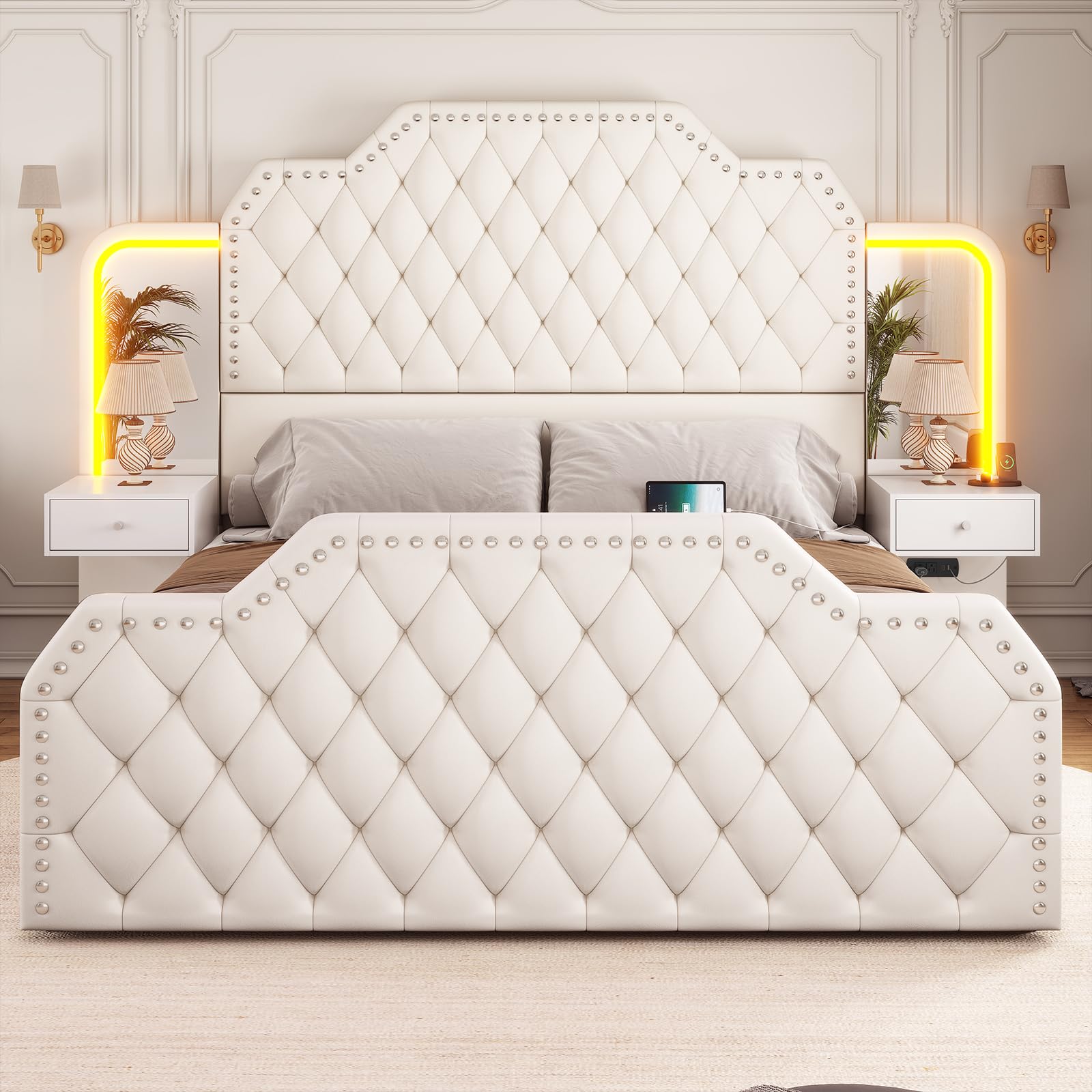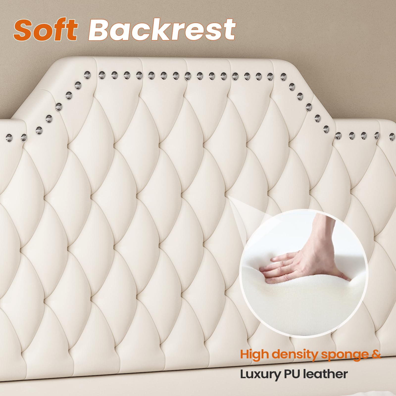 - Tall Headboard Design: The 53" high headboard and 23" high footboard create a grand, luxurious visual impact. Premium PU leather with nailhead trim and deep tufting accentuates the elegant style while providing comfortable support when sitting up in bed.