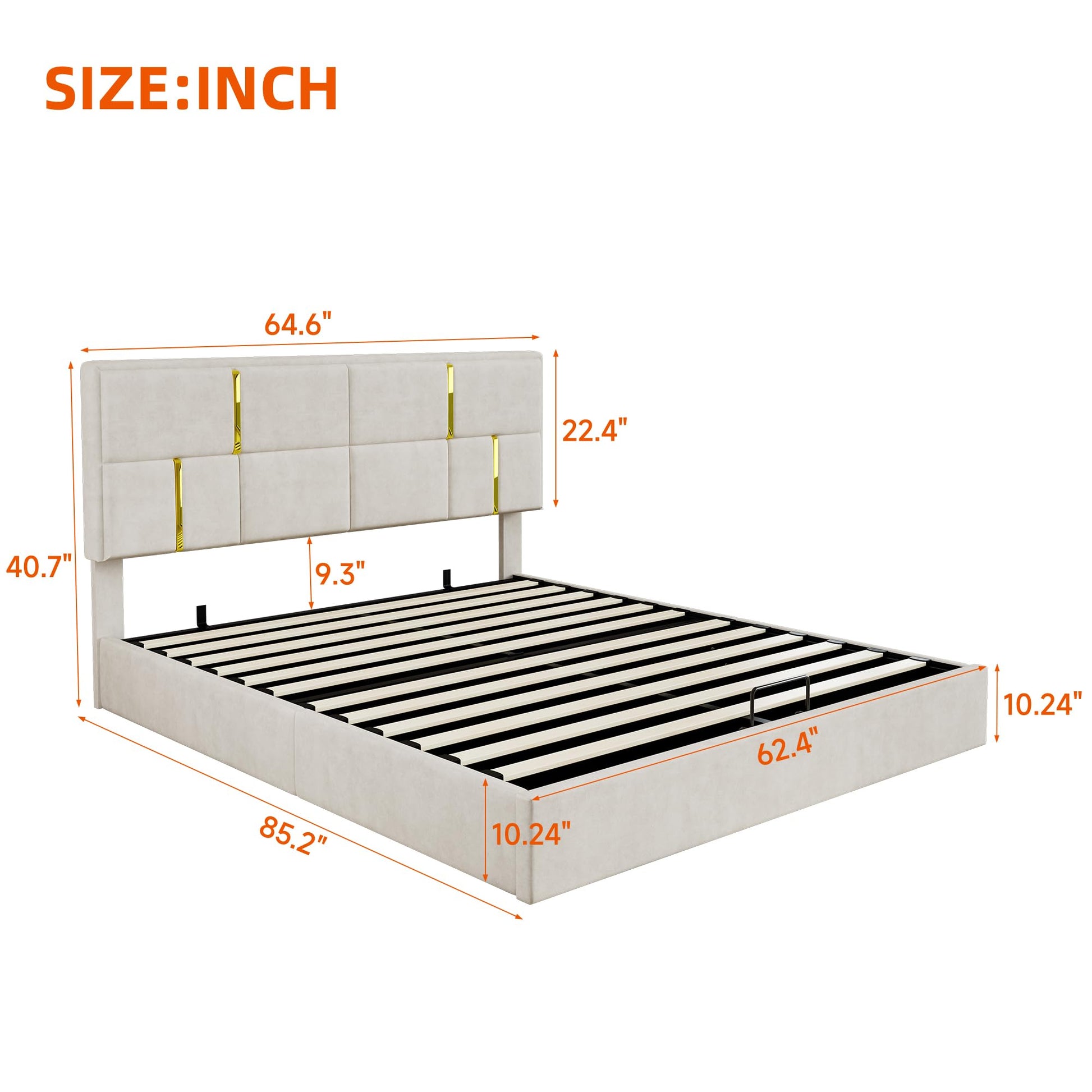 This elegant 2-piece bedroom set features a queen-size upholstered platform bed with hydraulic storage system and matching storage ottoman. The bed frame showcases soft velvet upholstery in white with gold decorative accents on the headboard, blending classic charm with modern aesthetics.