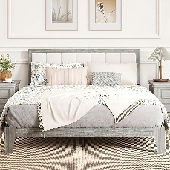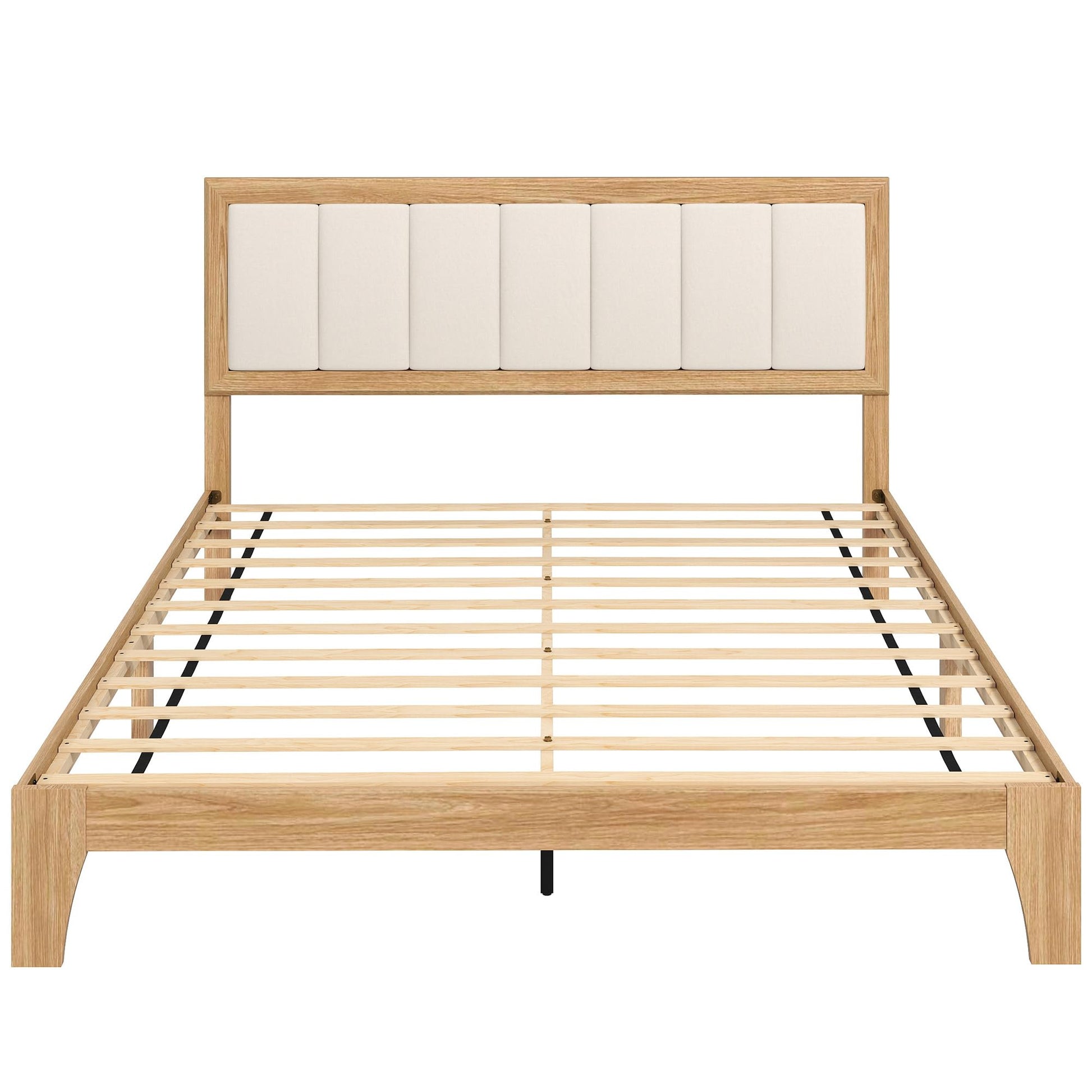 Elegant Design & Comfort: Featuring an upholstered headboard for maximum comfort during relaxation or reading sessions, this queen bed frame blends a linen-look fabric with a wood grain finish, offering a mid-century modern style to any bedroom decor.