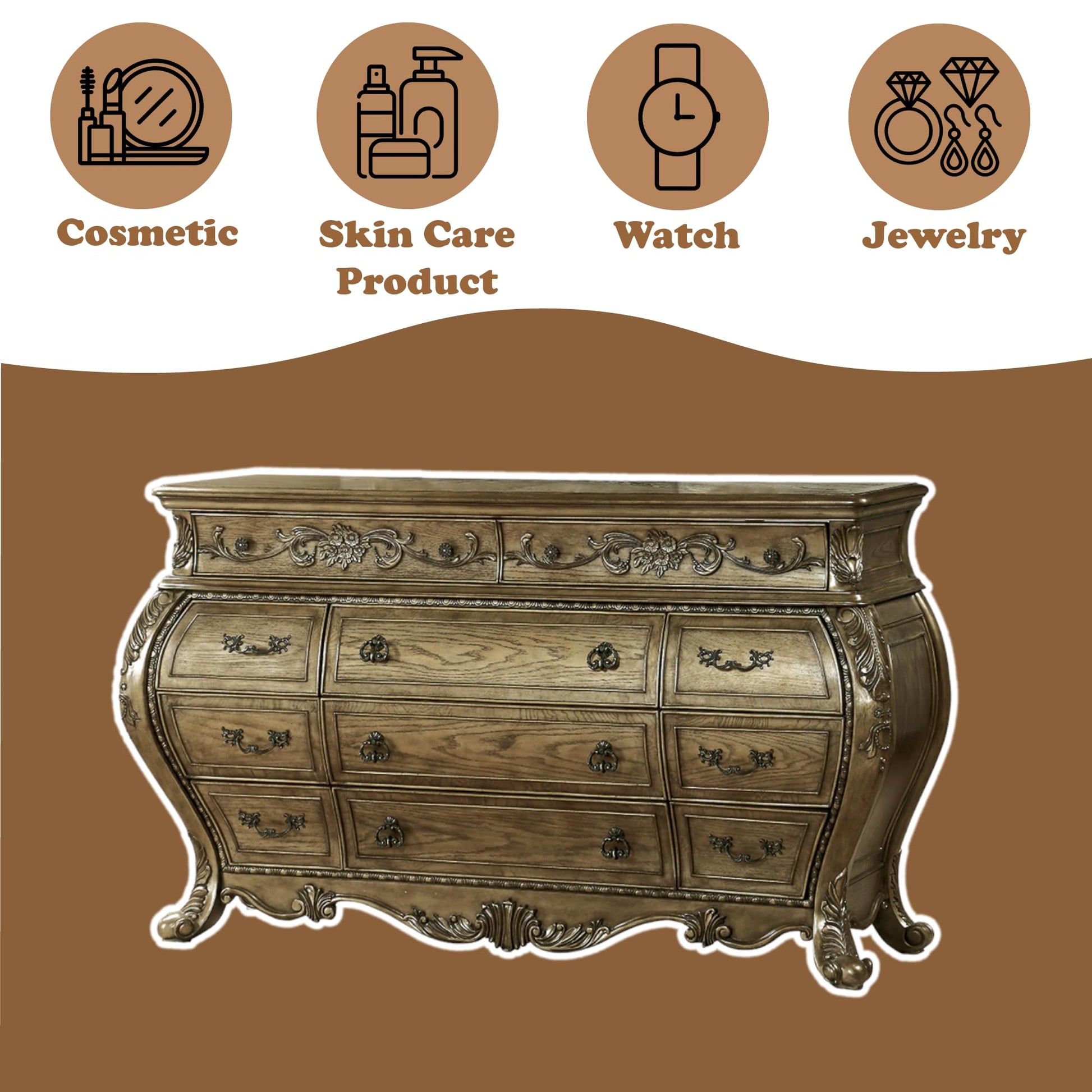 Elevate your bedroom or living space with this stunning 11-drawer dresser featuring a distinctive bombay shape and vintage oak finish. Designed for both style and functionality, this piece offers exceptional storage capacity with full-extension drawers that provide easy access to your belongings.