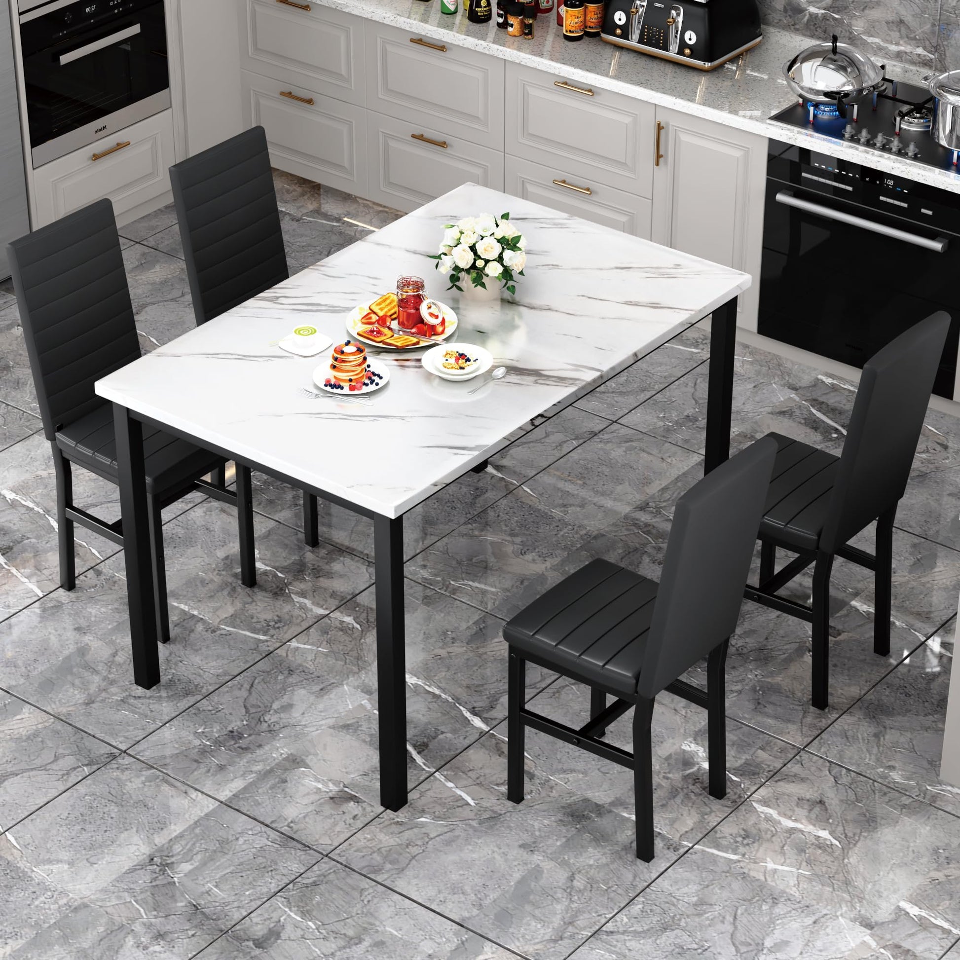 - [Modern Focal Point for Small Spaces]: Elevate your dining experience with the Recaceik 5-piece set, the perfect small dining table set for 4. The kitchen table boasts a stunning faux marble tabletop with a scratch-resistant, mirror-smooth surface that wipes clean in seconds. Designed for modern apartments and cozy breakfast nooks, this space-saving dinette set blends timeless elegance with practical daily use, making it the ideal centerpiece for your home.