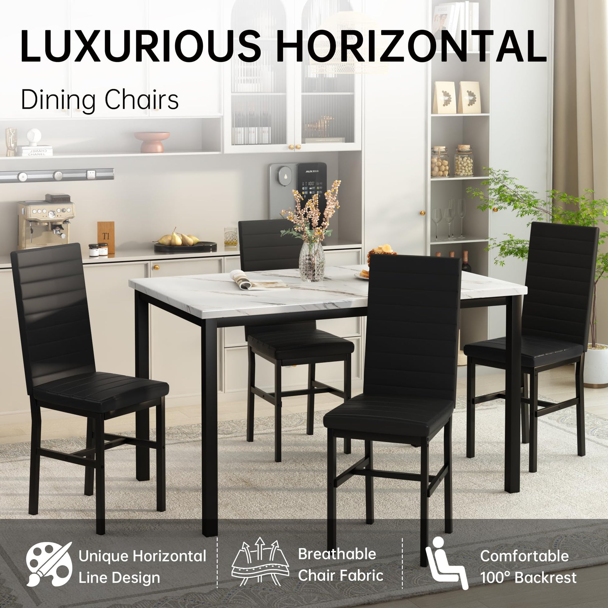 Recaceik 5-Piece Small Dining Table Set for 4, Modern Faux Marble Kitchen Table with 4 Upholstered PU Leather Chairs, Dining Room Table Set for Dinette, Breakfast Nook & Small Spaces, Black