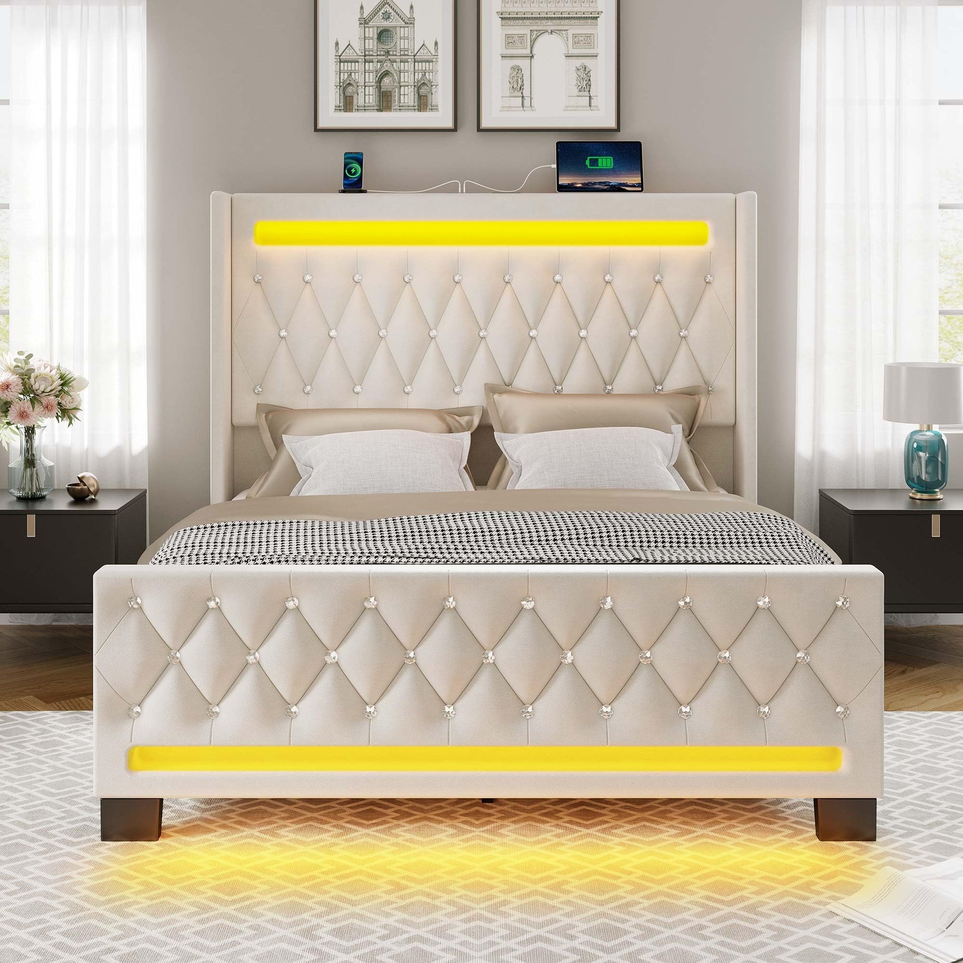 Rolanstar Queen Bed Frame with LED Light and Charging Station, Upholstered High Headboard and Footboard, Wood Slats, Noise Free, Easy Assembly, Beige