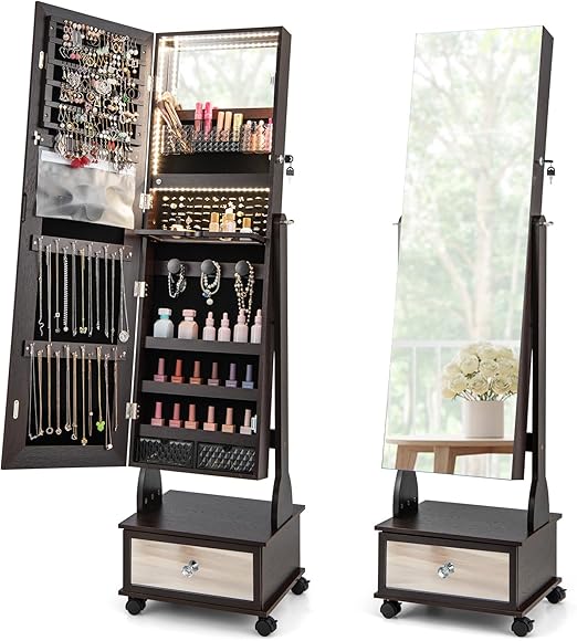 Transform your jewelry organization with this elegant rolling jewelry armoire featuring a full-length mirror and 3-color LED lighting. This lockable standing cabinet combines functionality with style, offering ample storage for your entire jewelry collection.