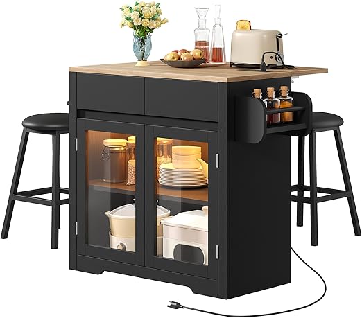 Rolling Kitchen Island with Seating and LED Lights