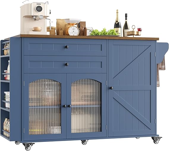 Transform your kitchen workspace with this versatile rolling island that combines ample storage, mobility, and functionality. Featuring a wood drop leaf countertop that expands your prep area when needed, this portable kitchen cart delivers professional-grade utility in a compact design.