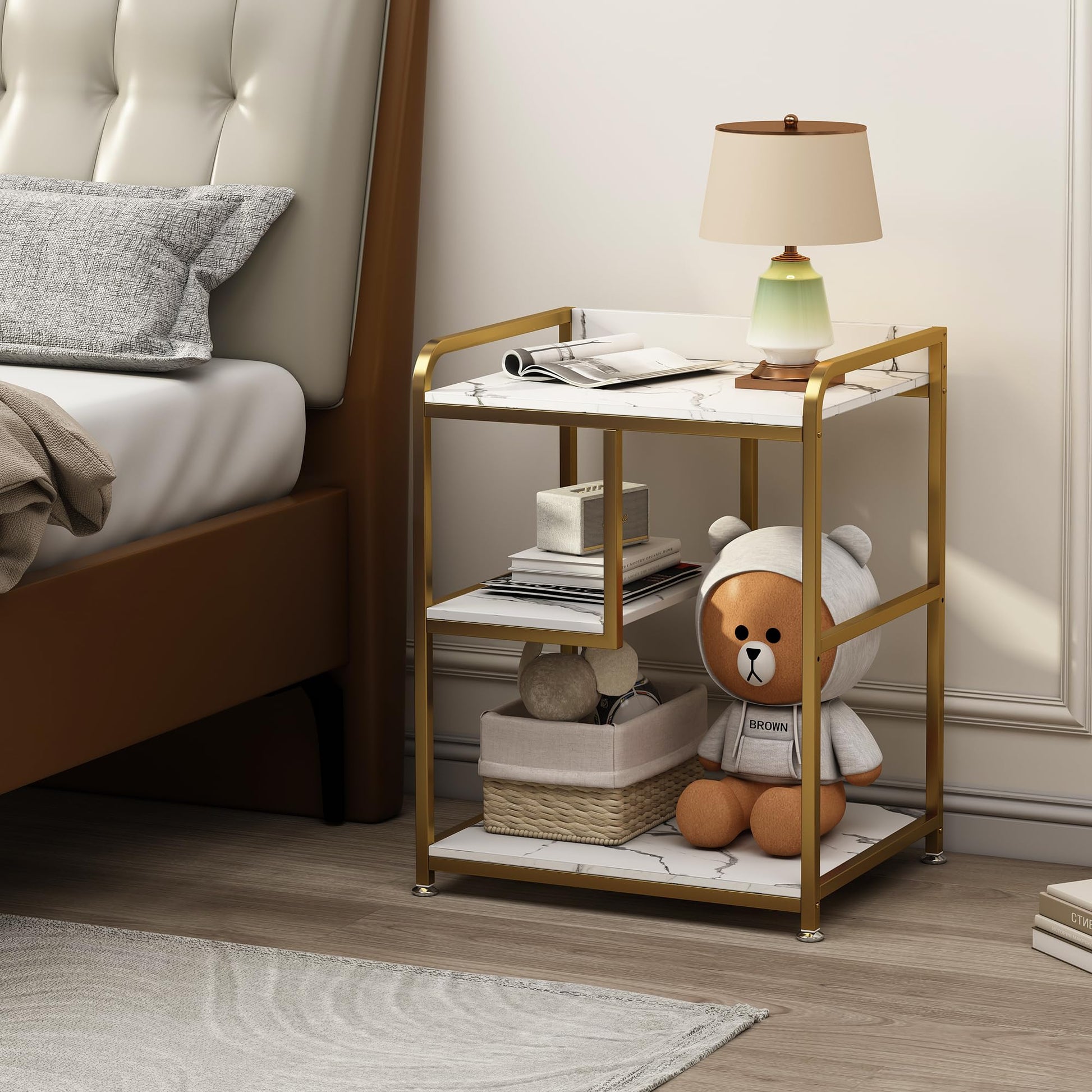 - Modern white marble finish with gold-tone framework