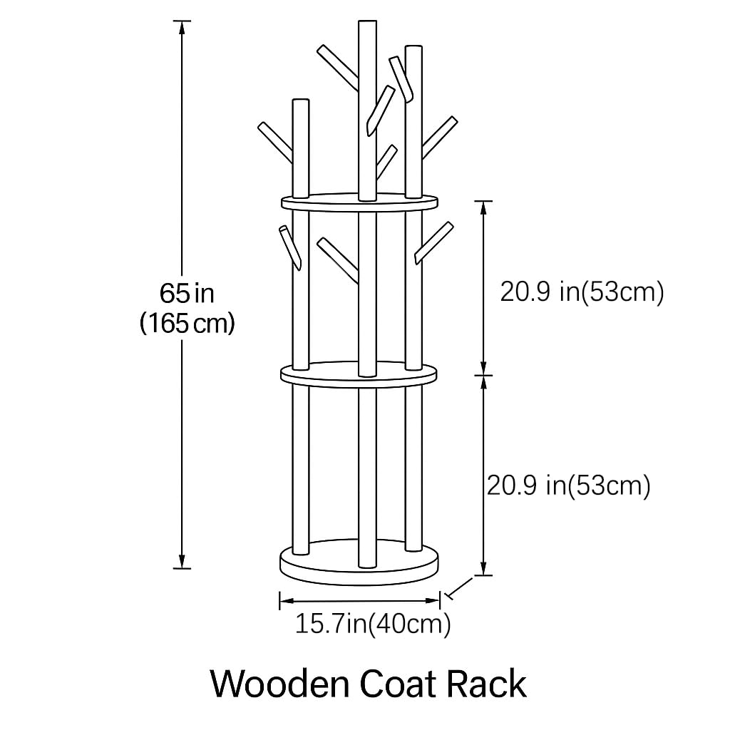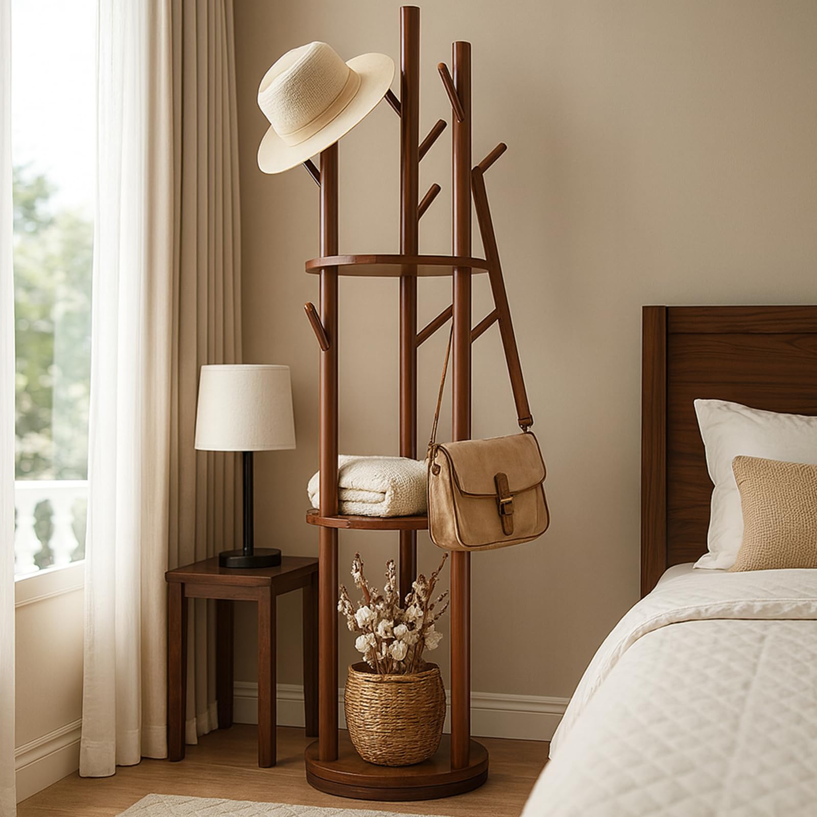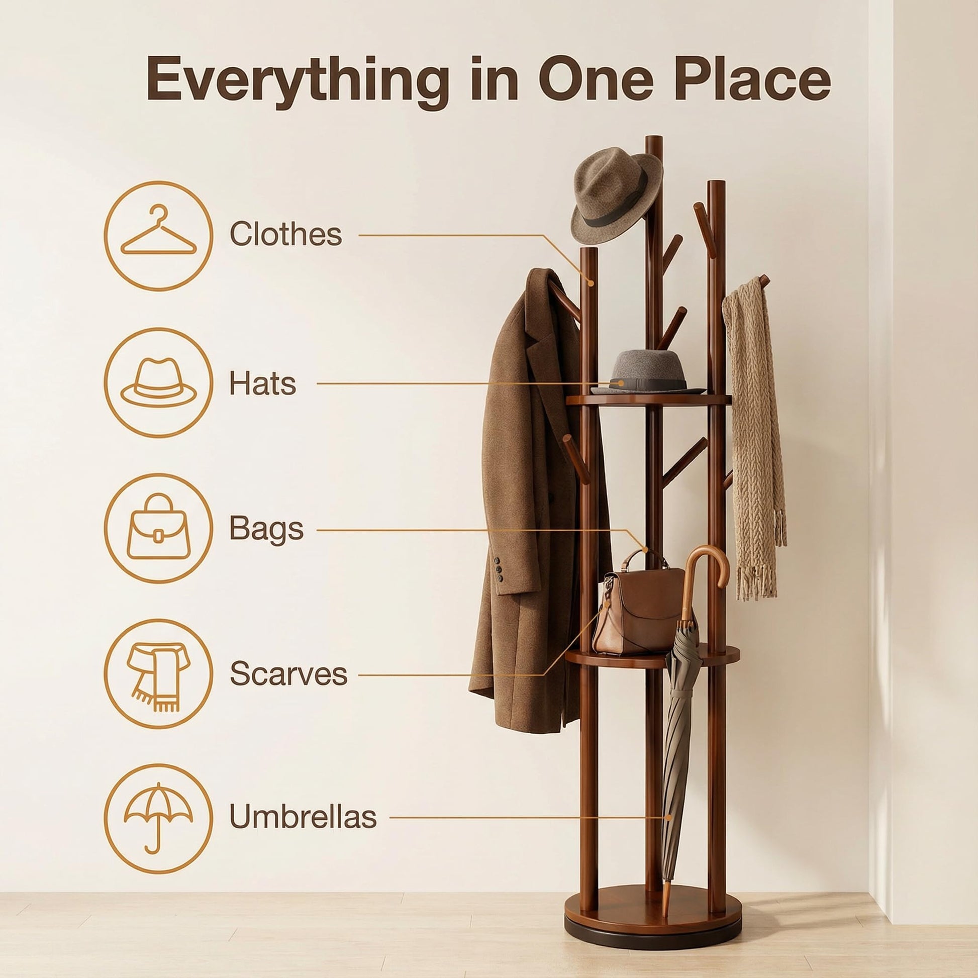 Experience effortless organization with this 360° rotating solid wood coat rack featuring three-tier storage shelves. Perfect for entryways, bedrooms, or offices, this modern space-saving organizer combines functionality with elegant walnut finish styling.