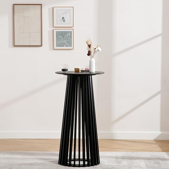 This minimalist round pub table features a pedestal design that complements most home decor styles. Perfect for dining rooms, living rooms, or as a versatile accent piece in your space.