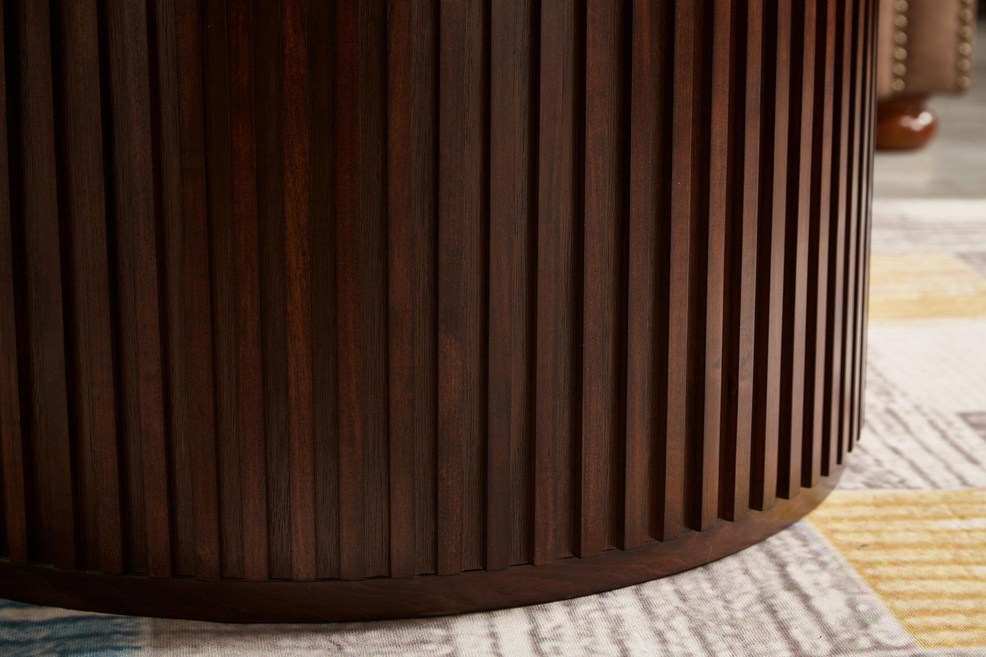 This contemporary drum-style coffee table arrives fully assembled and ready to use—no tools or complicated setup required. The solid wood construction ensures durability and stability, while the sleek circular design adds a sophisticated focal point to any room.