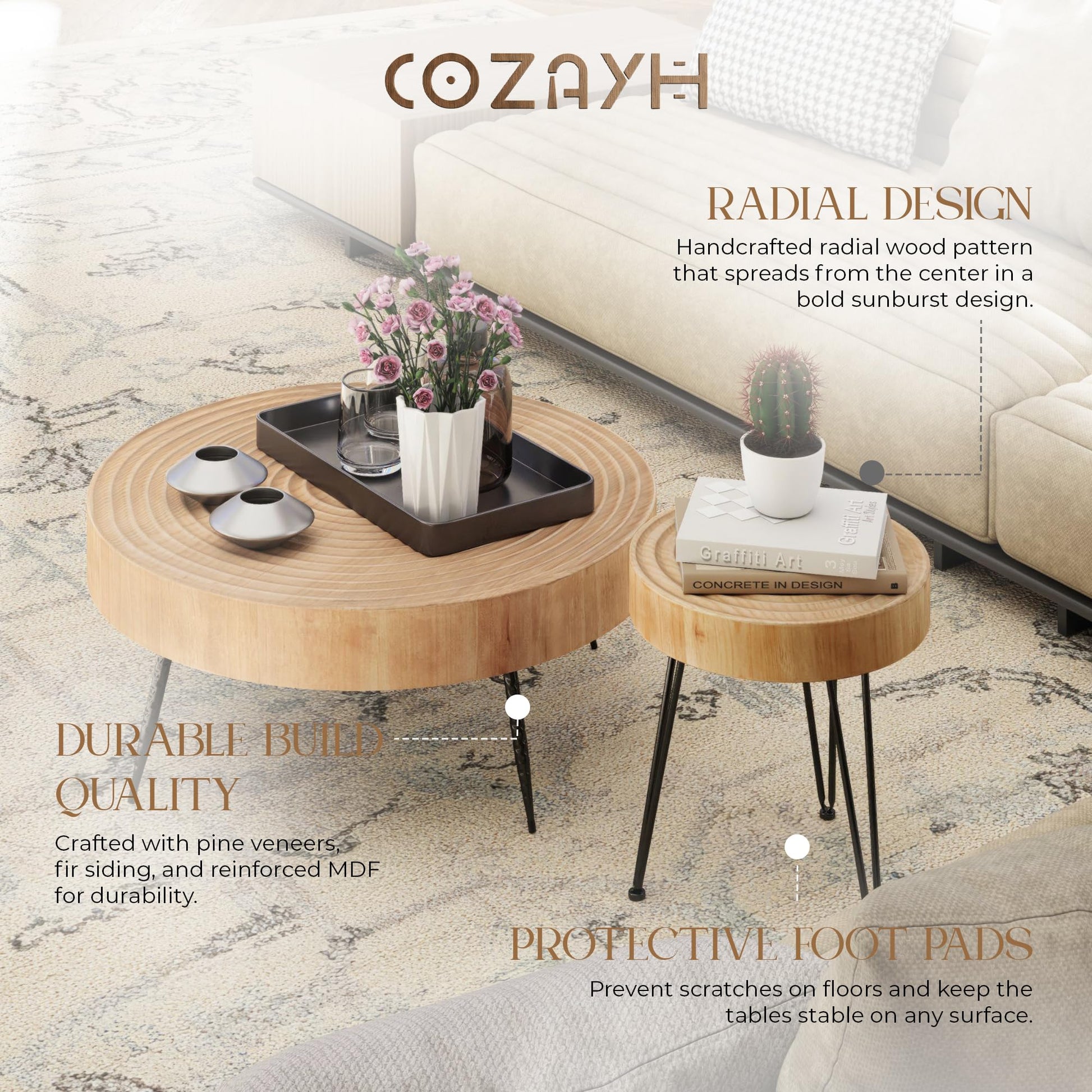 This 2-piece round nesting coffee table set combines rustic farmhouse charm with modern functionality. Featuring natural wood tops and sleek black metal legs with a distinctive ring pattern, these space-saving tables are perfect for living rooms or bedrooms.
