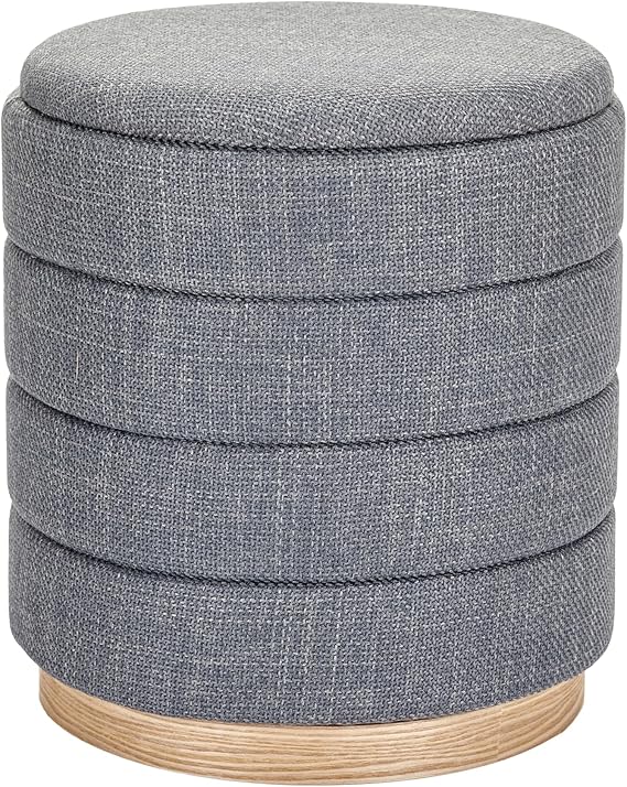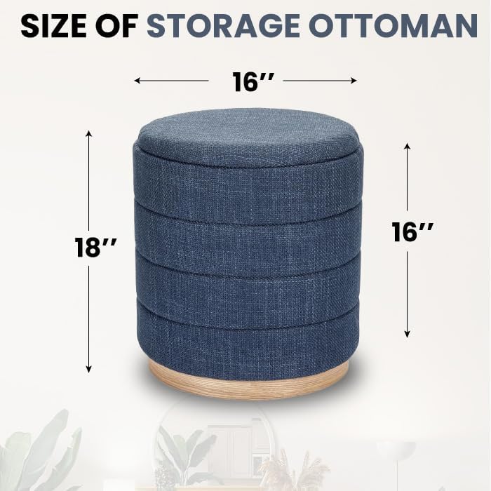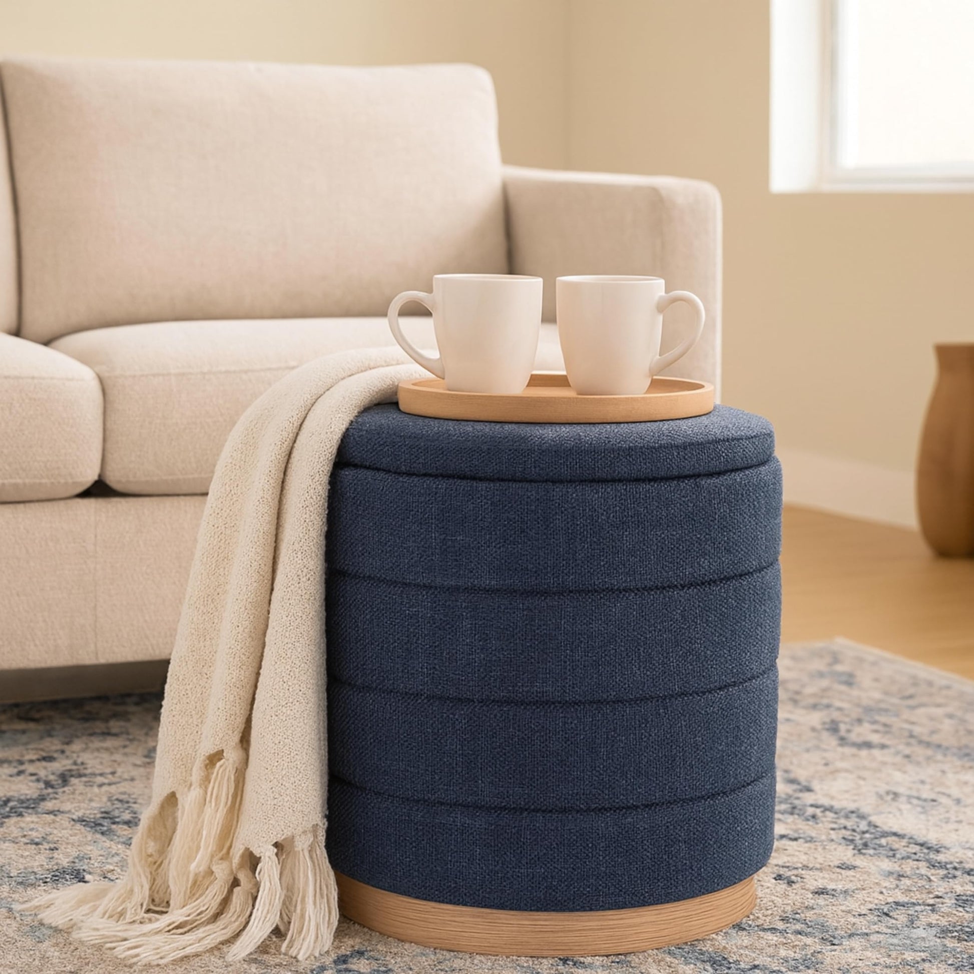Round Ottoman with Storage - Dark Blue Linen Upholstered Footrest