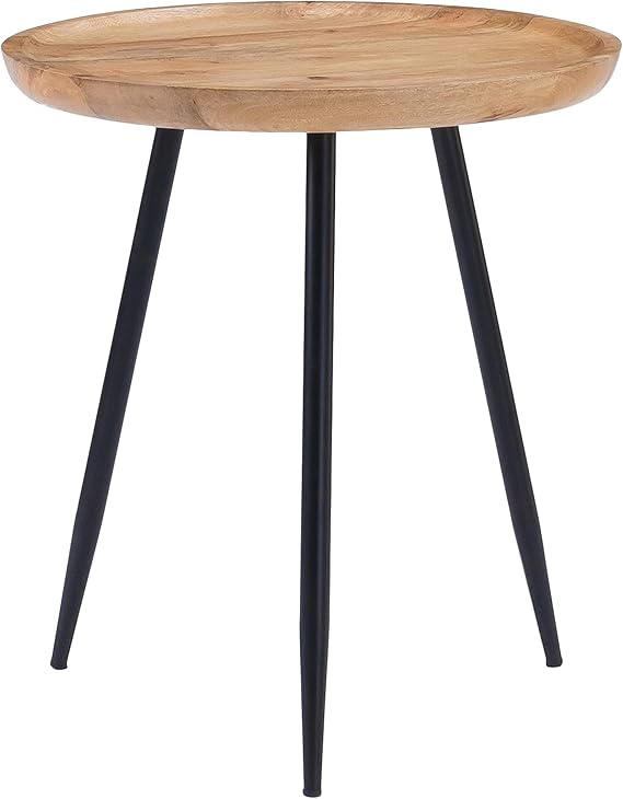 This contemporary round side table combines natural mango wood with sleek metal legs, creating a perfect accent piece for bedrooms, living rooms, or home offices. The minimalist design features a lipped tabletop that prevents items from rolling off, while the stable slender legs provide reliable support.