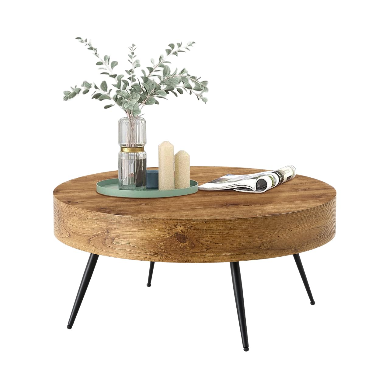 Transform your living room with this elegant round wood coffee table featuring a classic circular design that complements any interior style. The natural wood grain tabletop paired with sleek black metal legs creates a sophisticated aesthetic perfect for contemporary homes and apartments.