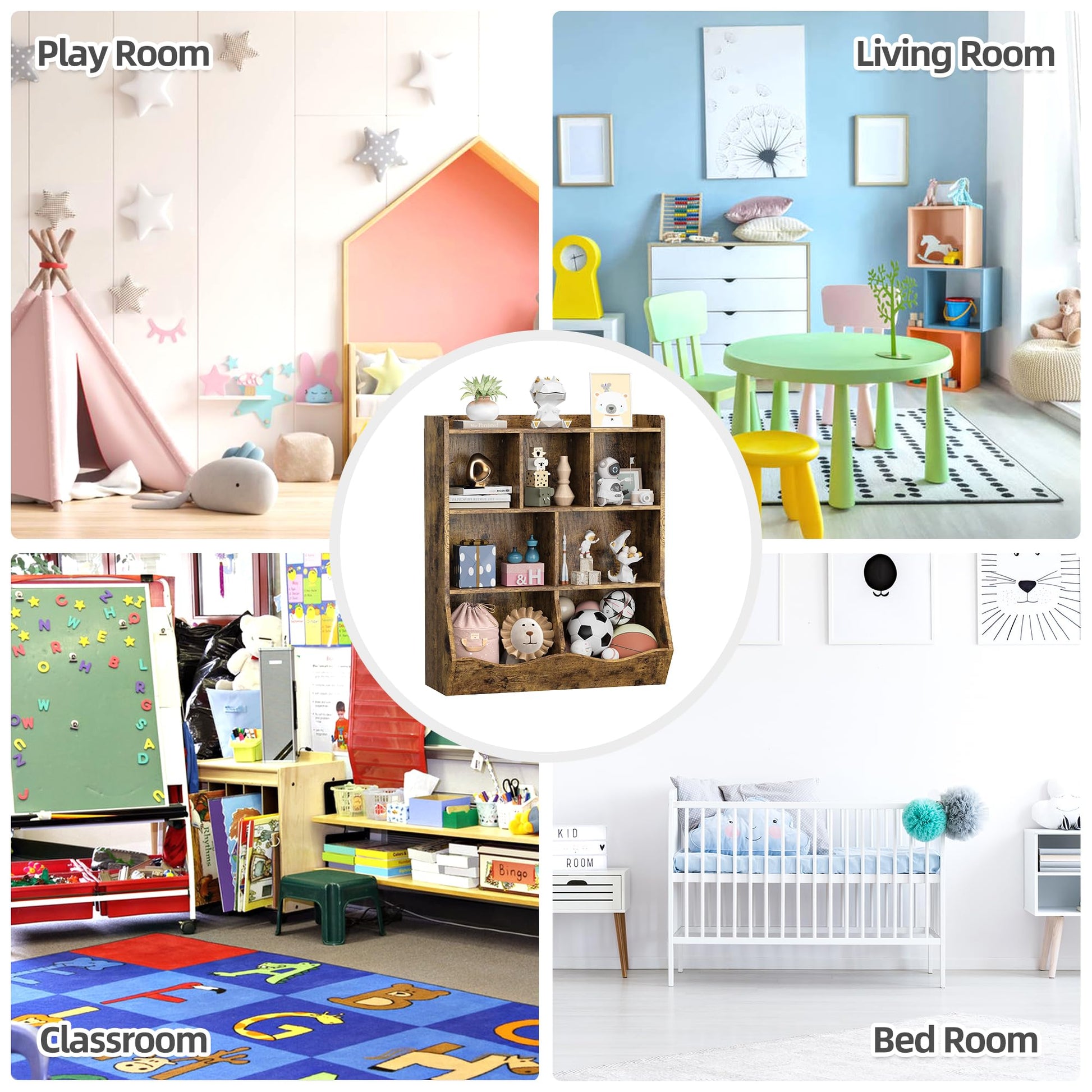 This three-tier toy storage cabinet combines practical organization with kid-friendly design. Featuring 5 open compartments and 2 tilting storage bins, it provides versatile storage for books, toys, and decorative items while keeping everything within easy reach for children.